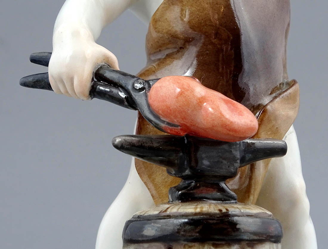 Amor jako kowal wykuwający serce, stojący na okrągłej podstawie z kilkoma złoceniami dookoła, z zielonymi listkami przy gołych stopach. Obok na drewnianym pniu stojące kowadło, na którym trzymane w szczypcach jest wykuwane serce. Amor ubrany w strój kowalski, z czapeczką na głowie i skrzydłami.