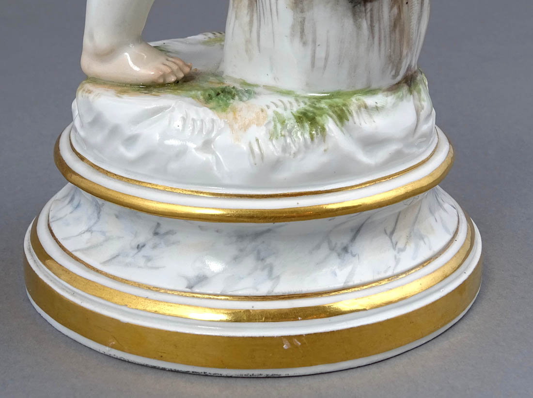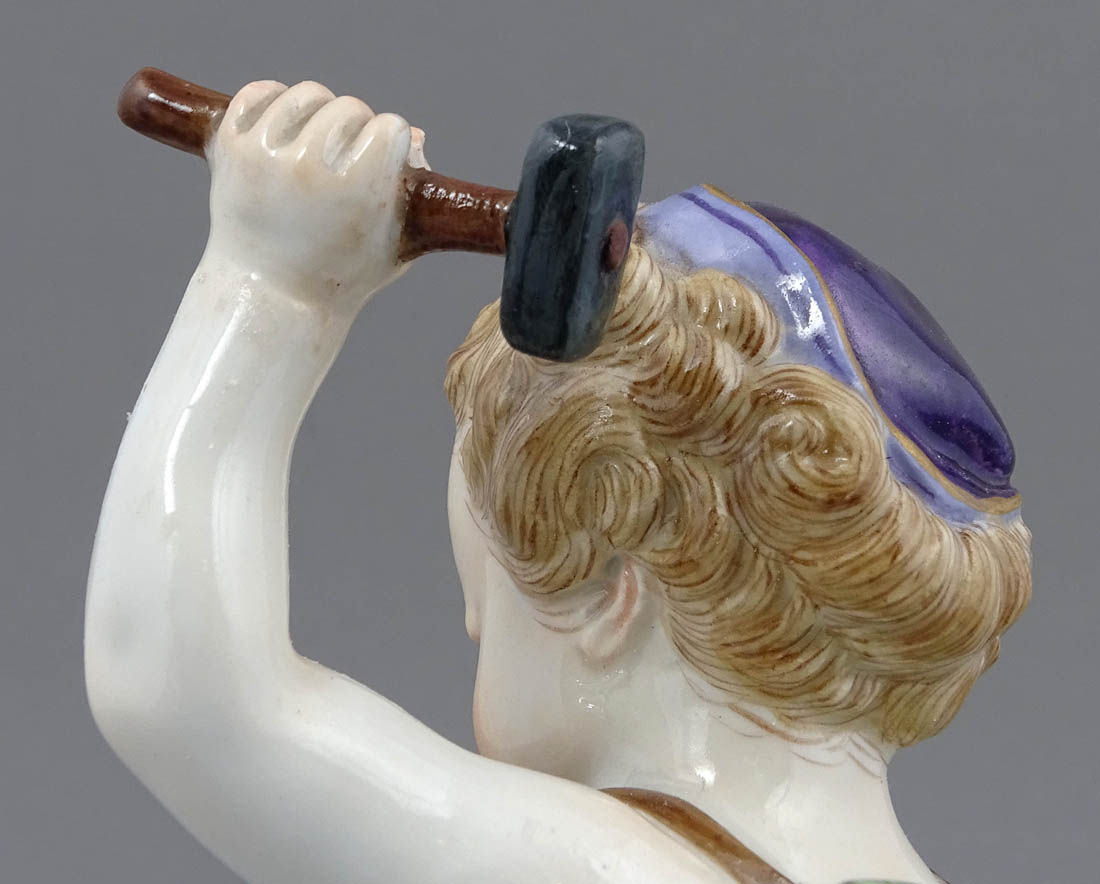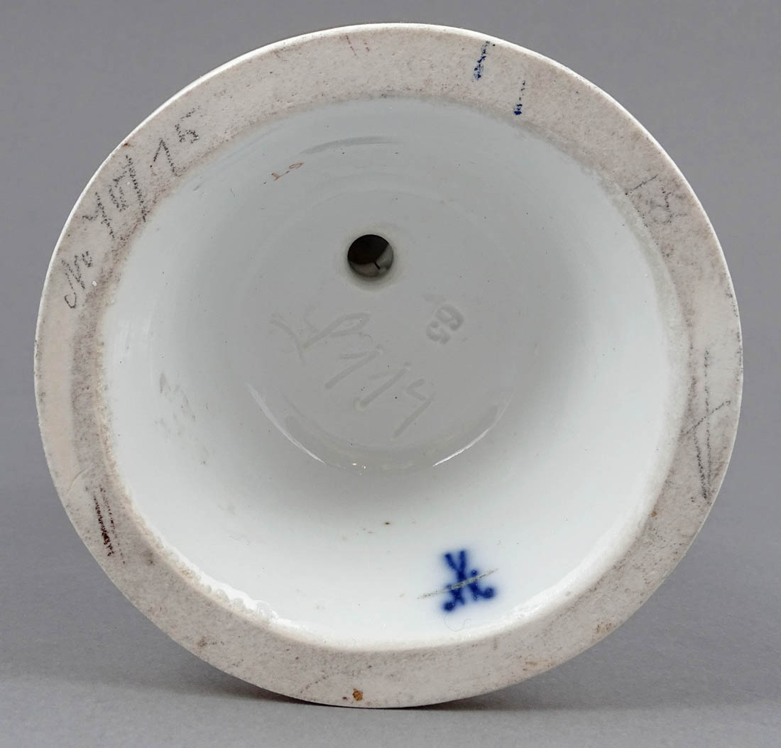 Figurka projektu Heinricha Schwabe, sygnowana od spodu podszkliwnie kobaltem w kształcie dwóch przecinających się mieczy, znak manufaktury miśnieńskiej używanej w latach 1850-1924. Widoczne także wyciśnięte w masie numer modelu „114” i liczba „65”.
