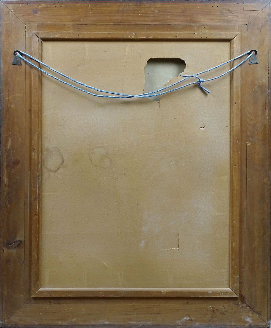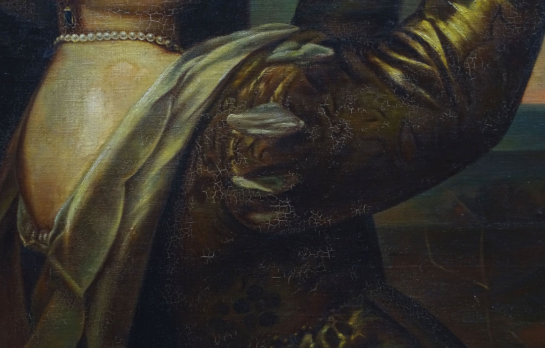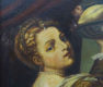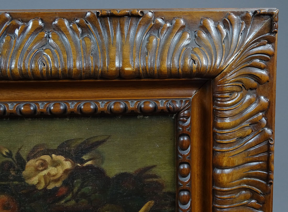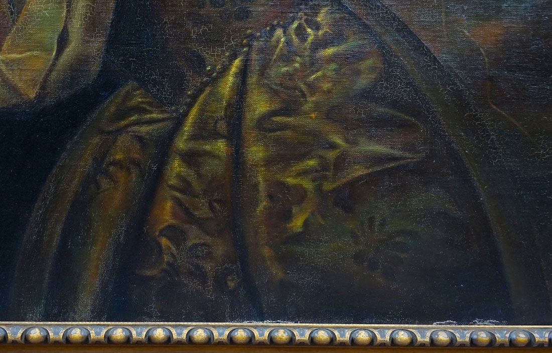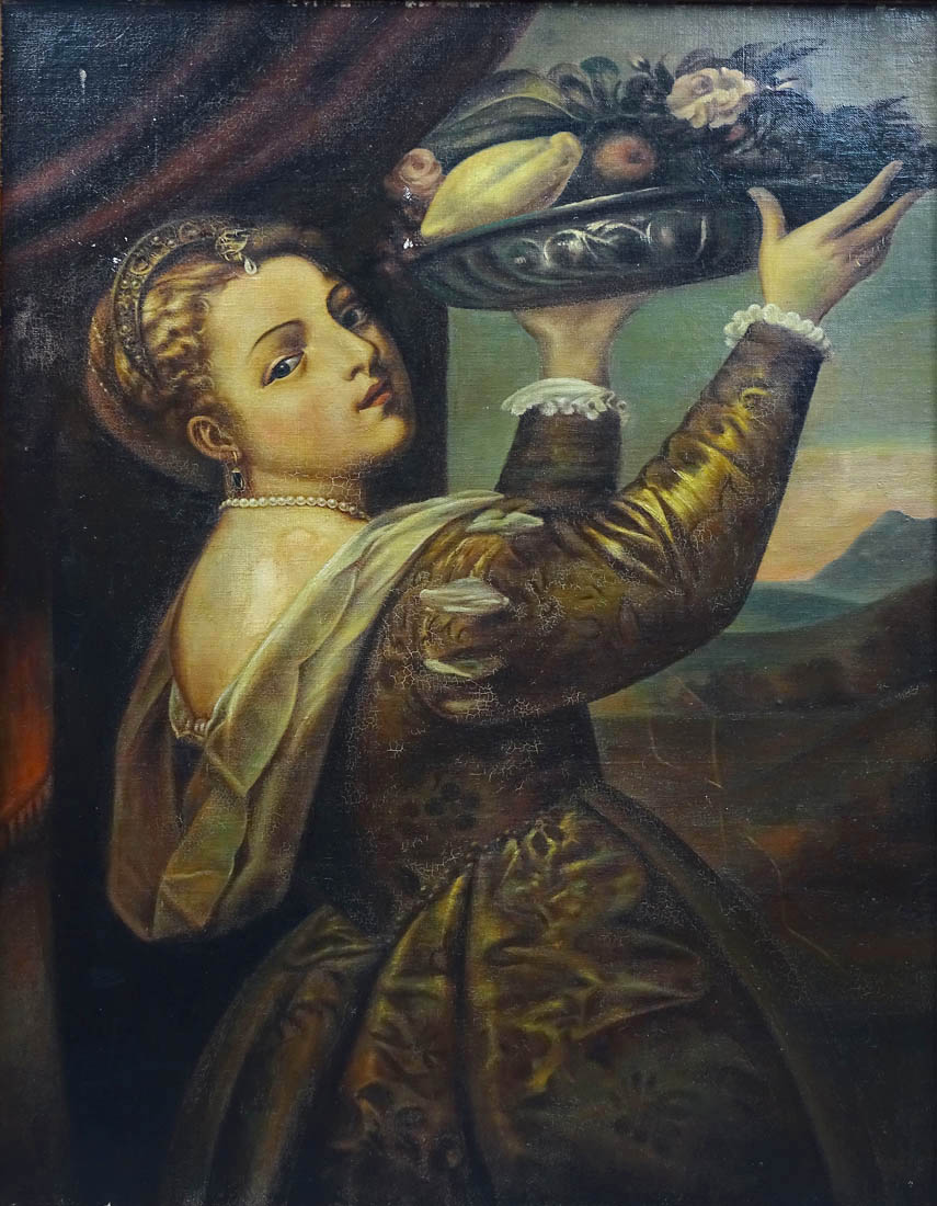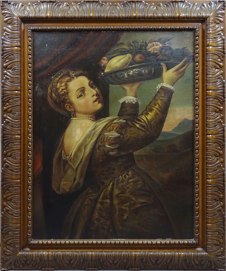 Obraz przedstawiający młodą kobietę, trzymającą w dłoniach tacę pełną owoców, ubraną w dworski strój, zaś na drugim planie widoczny górzysty krajobraz. Rama szeroka, drewniana, rzeźbiona na całym obwodzie w postaci liści akantu, z połączonymi oryginalnie narożnikami.
