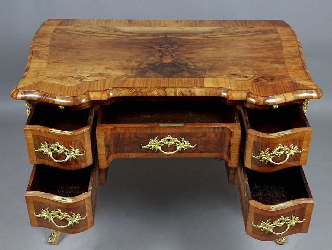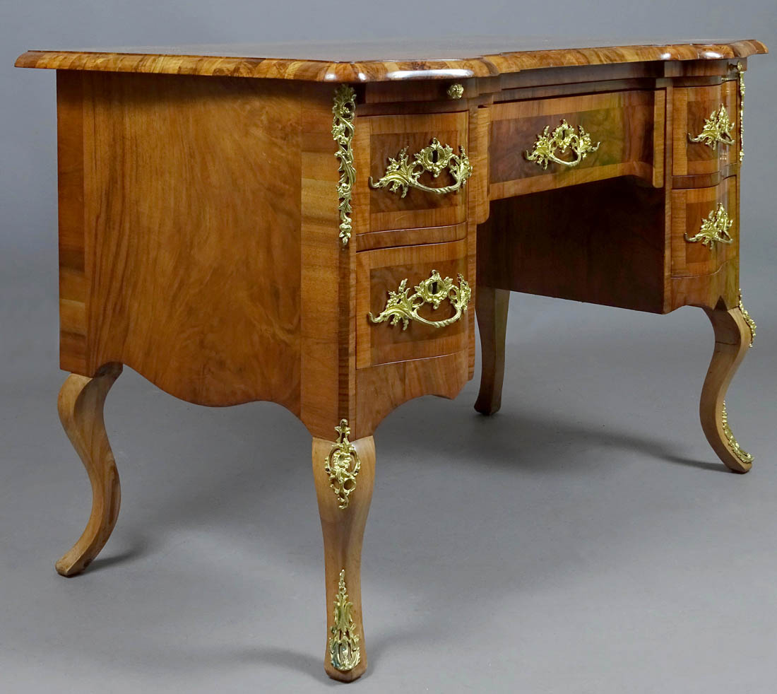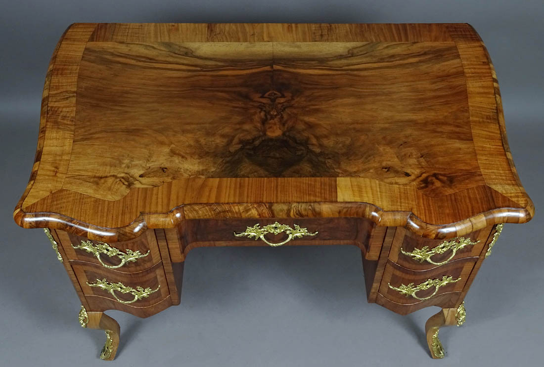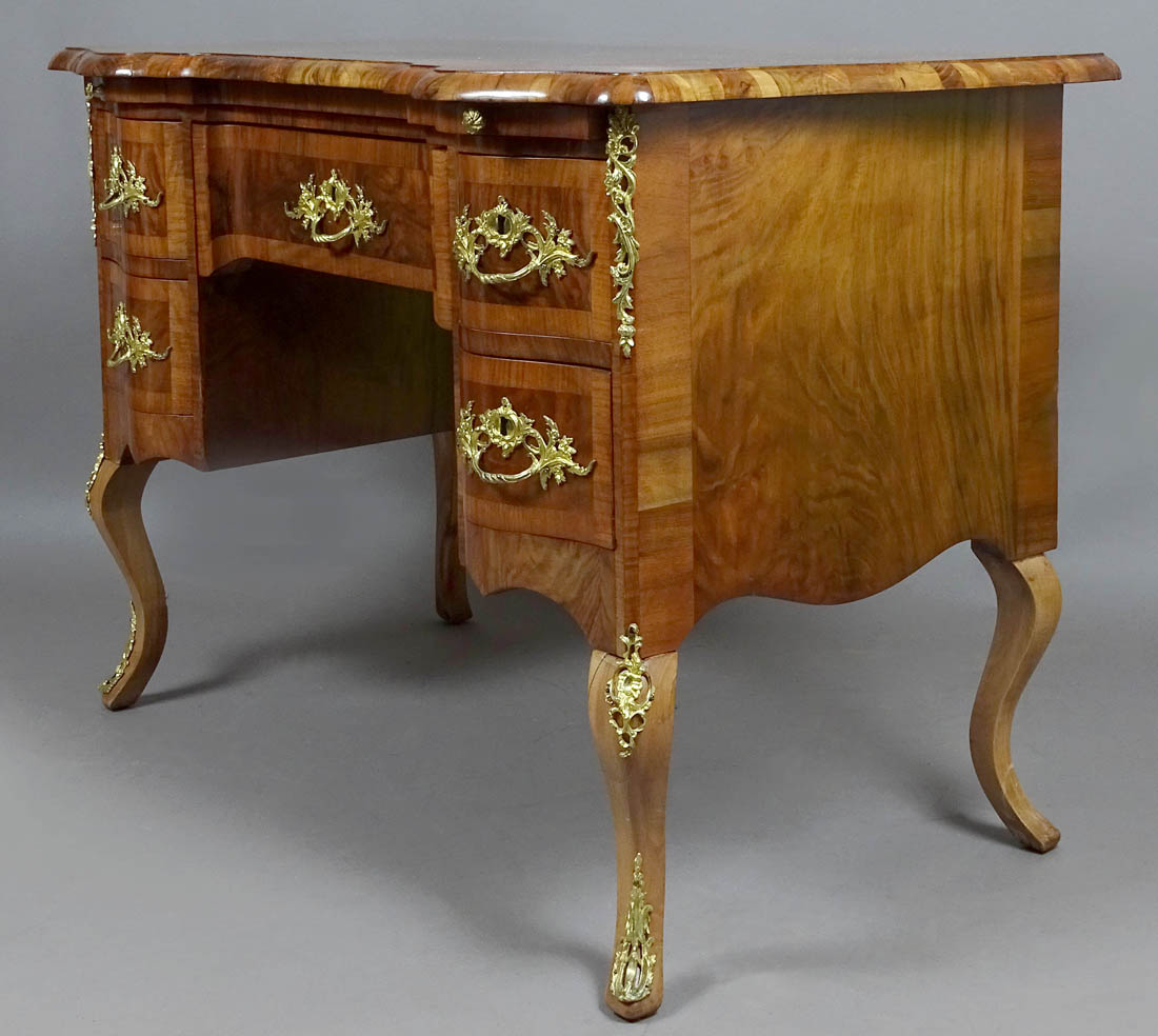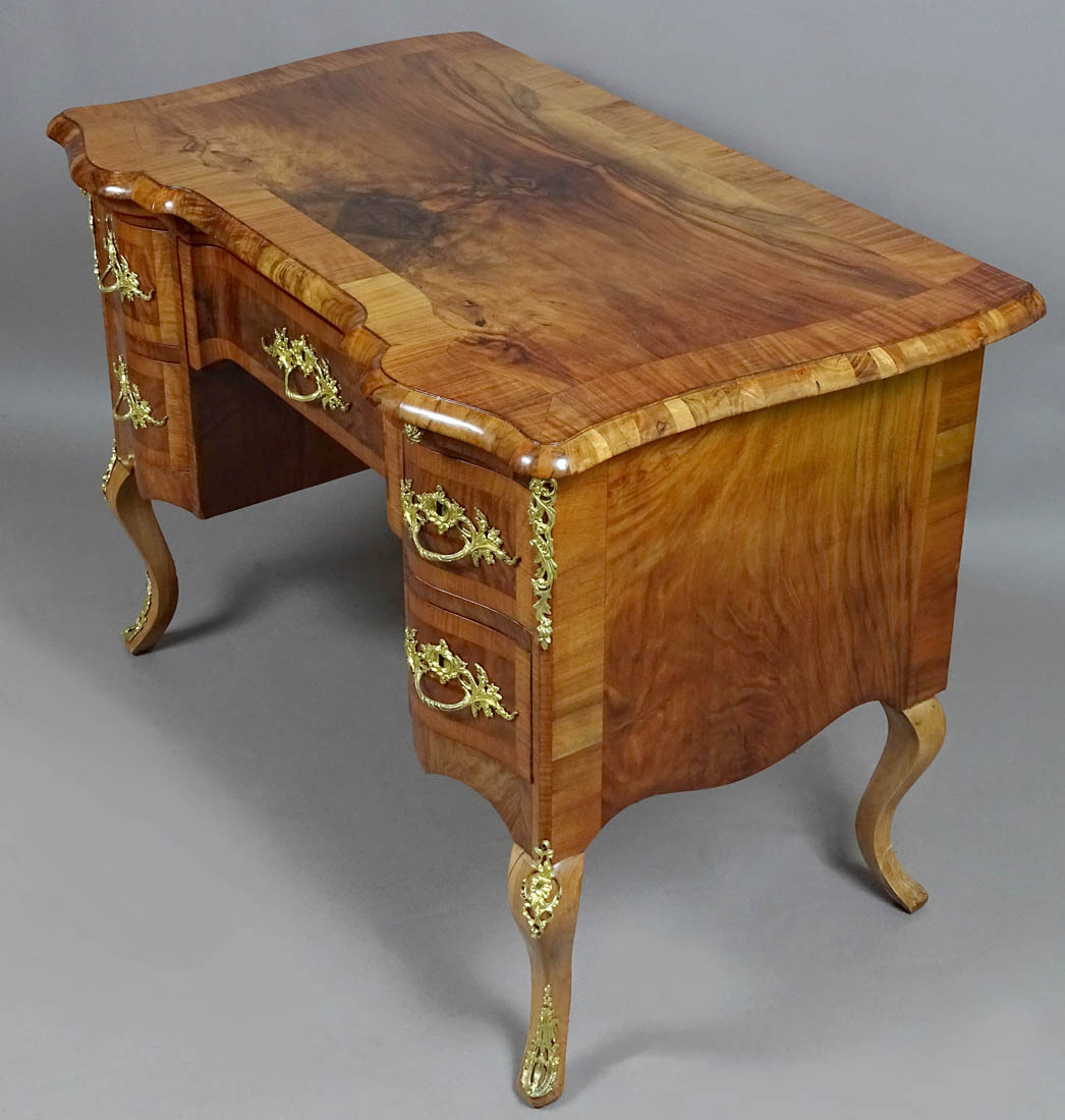 A Dresden-style desk with straight sides and a curved front, supported by four cabriole legs decorated with openwork brass appliqués. The frame contains five curved drawers with a central draw and keyhole, as well as a recessed steel lock and key. The top is gently rounded on the sides, while the front repeats the drawer outline, slightly protruding beyond the furniture’s outline, with two wooden veins around the perimeter. A pull-out auxiliary top, upholstered in green cloth, extends beneath the main top. The front corners are rounded and decorated with brass appliqués in the form of plant tendrils, and similar appliqués are also found on the front legs. Pine construction, walnut veneers, brass fittings, circa 1900.