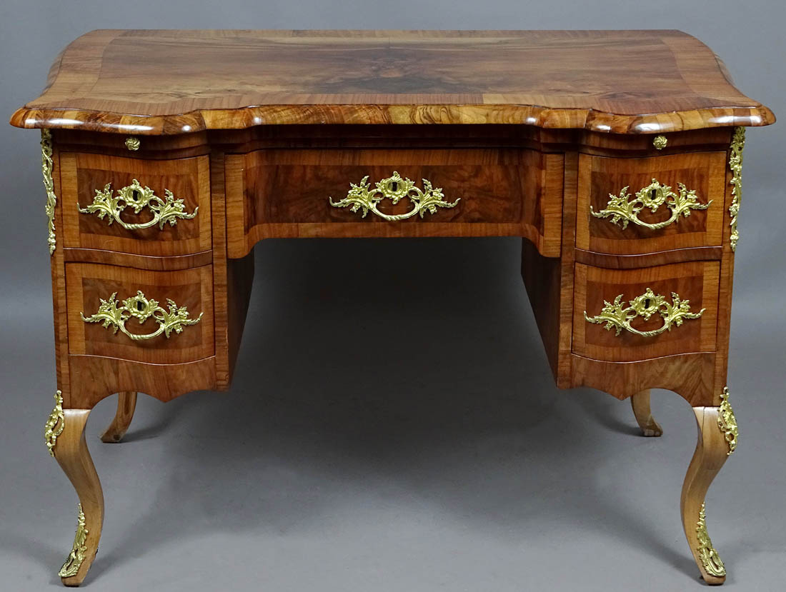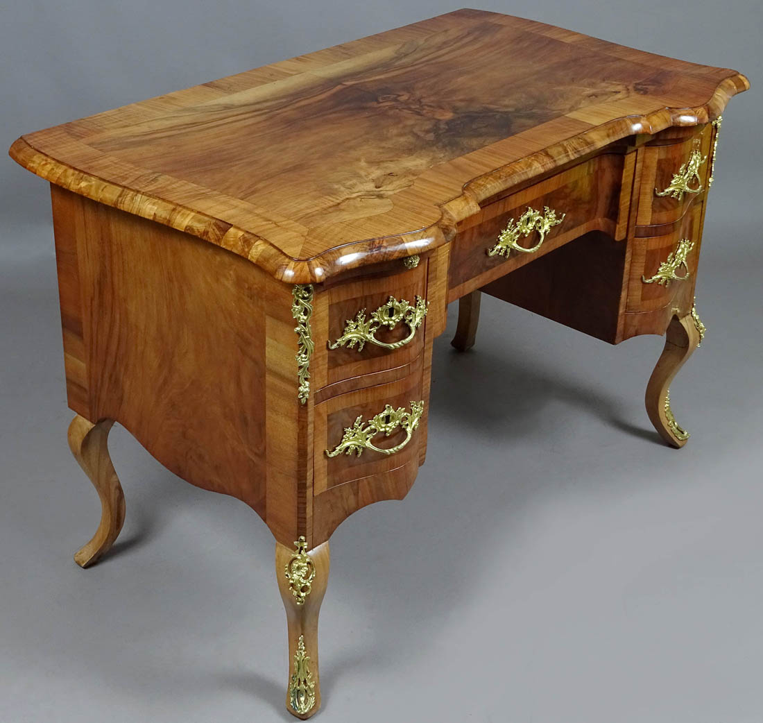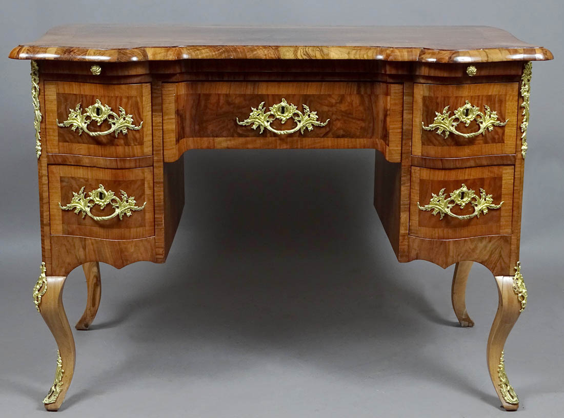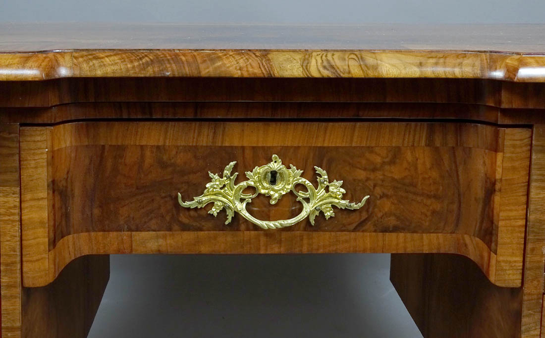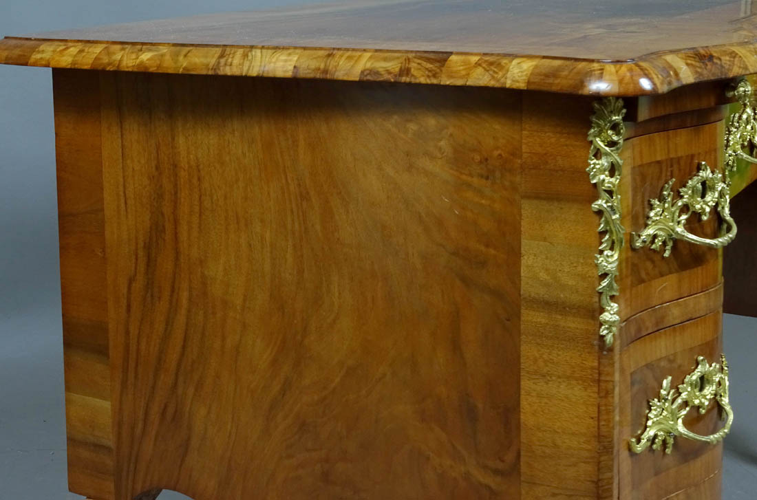 A Dresden-style desk with straight sides and a curved front, supported by four cabriole legs decorated with openwork brass appliqués. The frame contains five curved drawers with a central draw and keyhole, as well as a recessed steel lock and key. The top is gently rounded on the sides, while the front repeats the drawer outline, slightly protruding beyond the furniture’s outline, with two wooden veins around the perimeter. A pull-out auxiliary top, upholstered in green cloth, extends beneath the main top. The front corners are rounded and decorated with brass appliqués in the form of plant tendrils, and similar appliqués are also found on the front legs. Pine construction, walnut veneers, brass fittings, circa 1900.