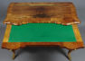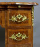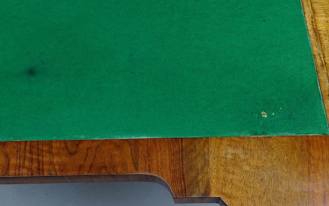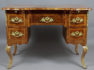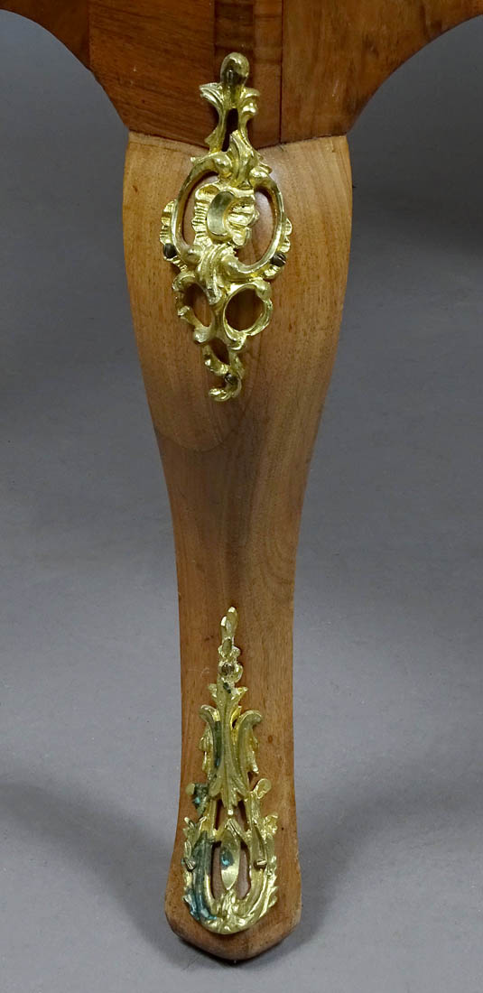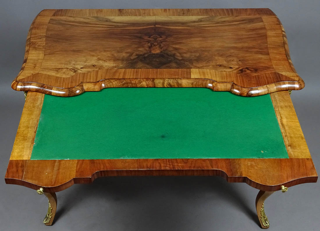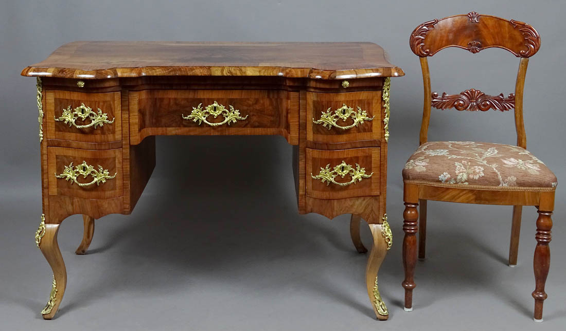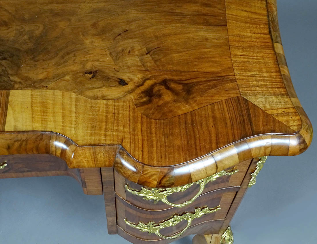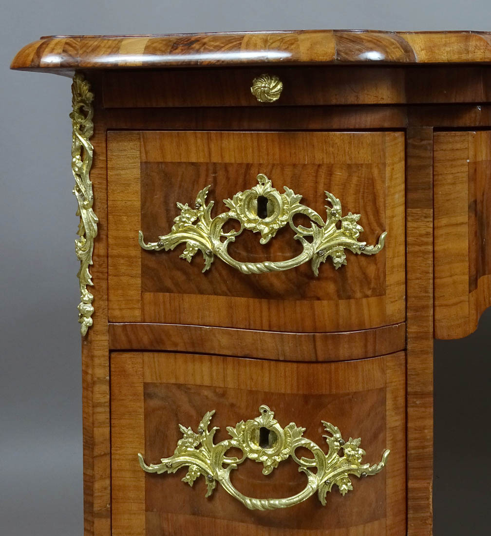 A Dresden-style desk with straight sides and a curved front, supported by four cabriole legs decorated with openwork brass appliqués. The frame contains five curved drawers with a central draw and keyhole, as well as a recessed steel lock and key. The top is gently rounded on the sides, while the front repeats the drawer outline, slightly protruding beyond the furniture’s outline, with two wooden veins around the perimeter. A pull-out auxiliary top, upholstered in green cloth, extends beneath the main top. The front corners are rounded and decorated with brass appliqués in the form of plant tendrils, and similar appliqués are also found on the front legs. Pine construction, walnut veneers, brass fittings, circa 1900.