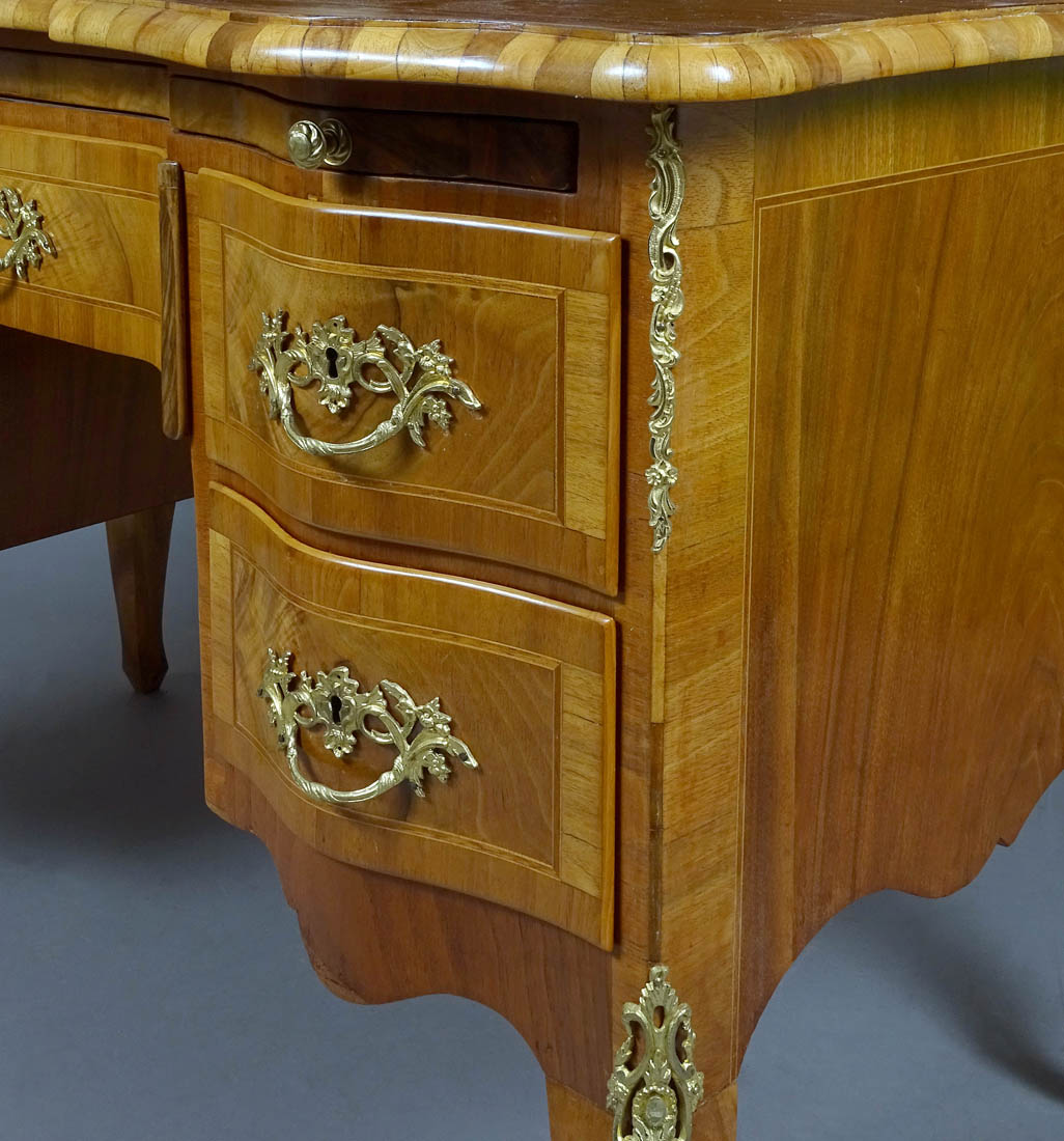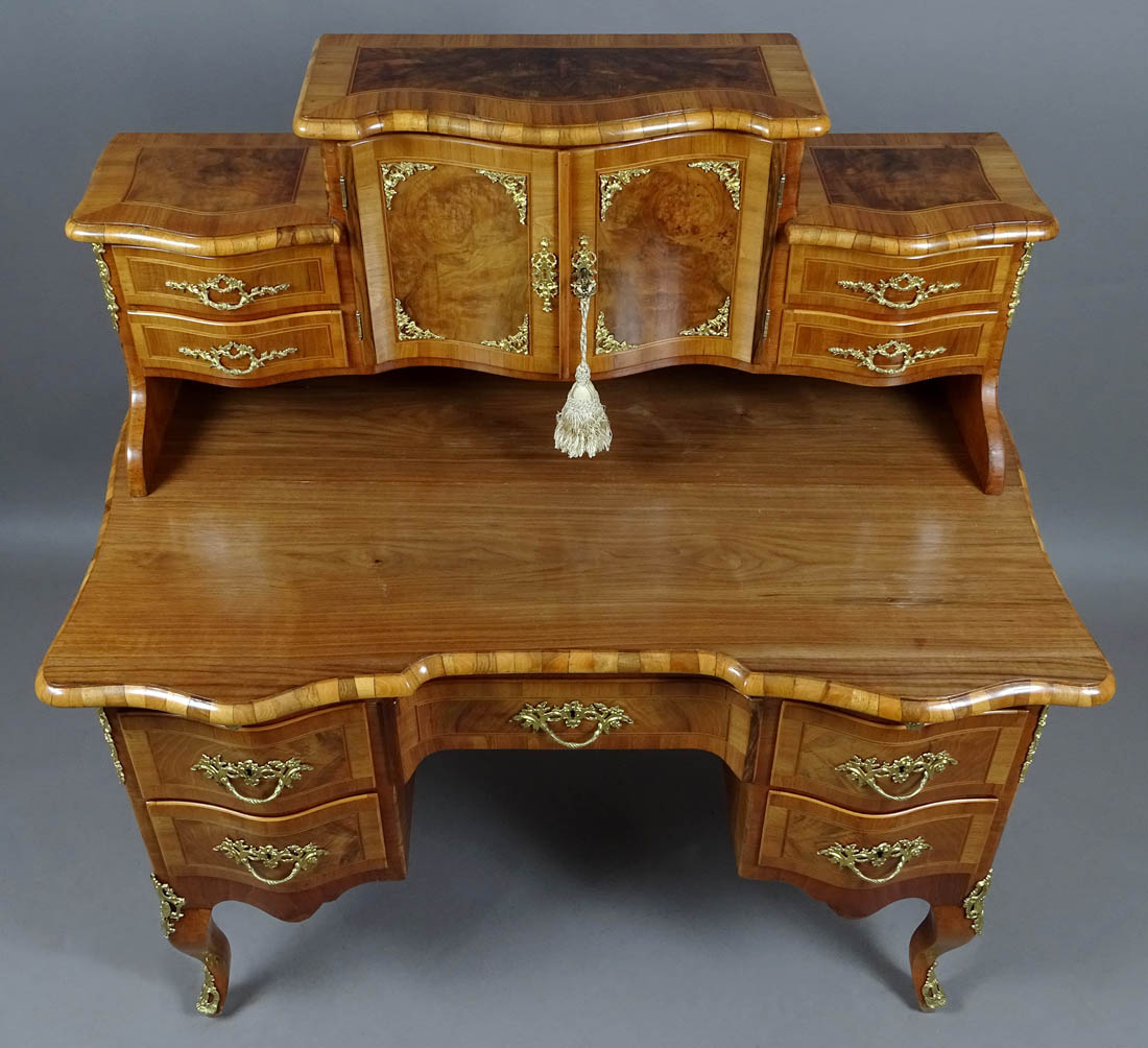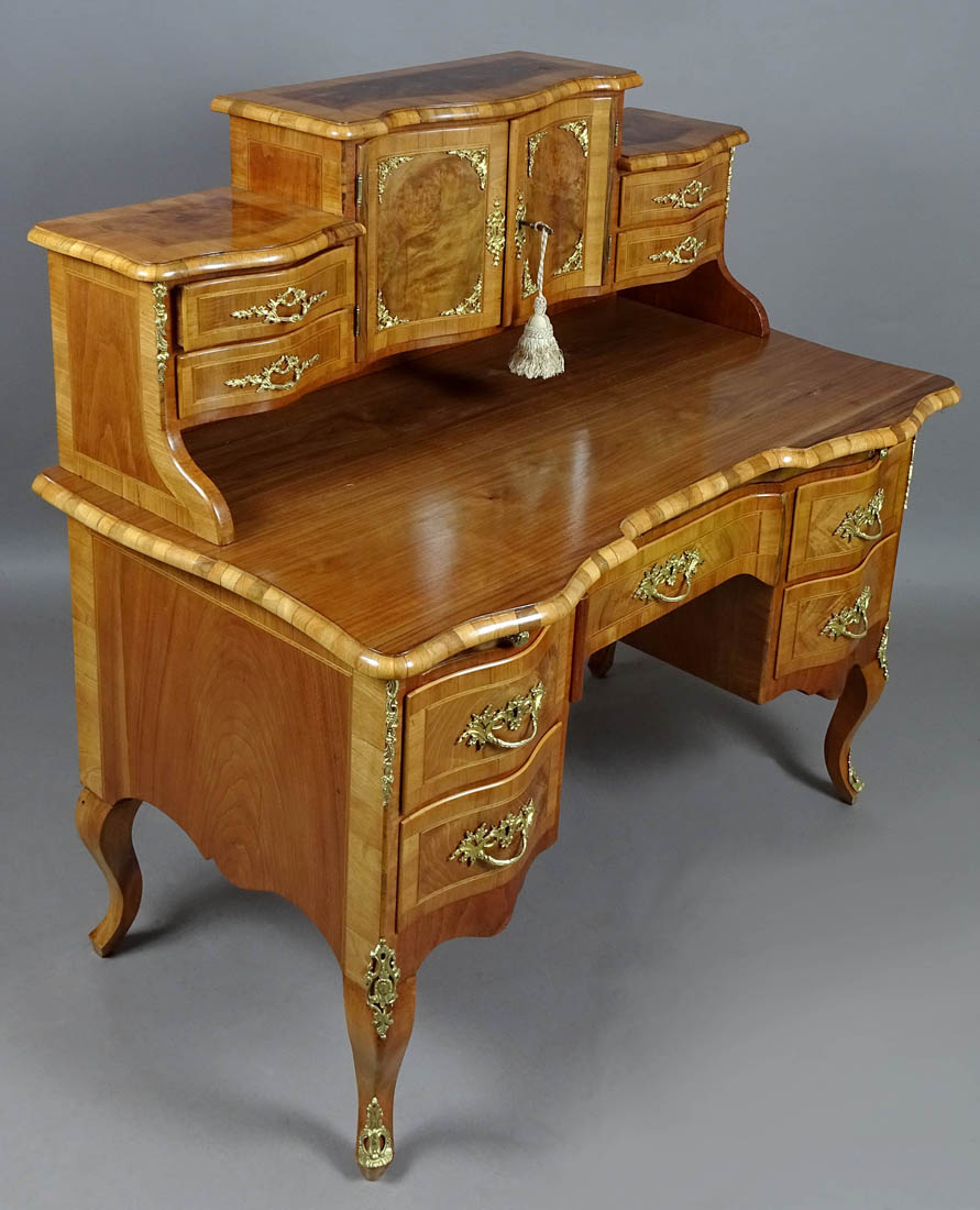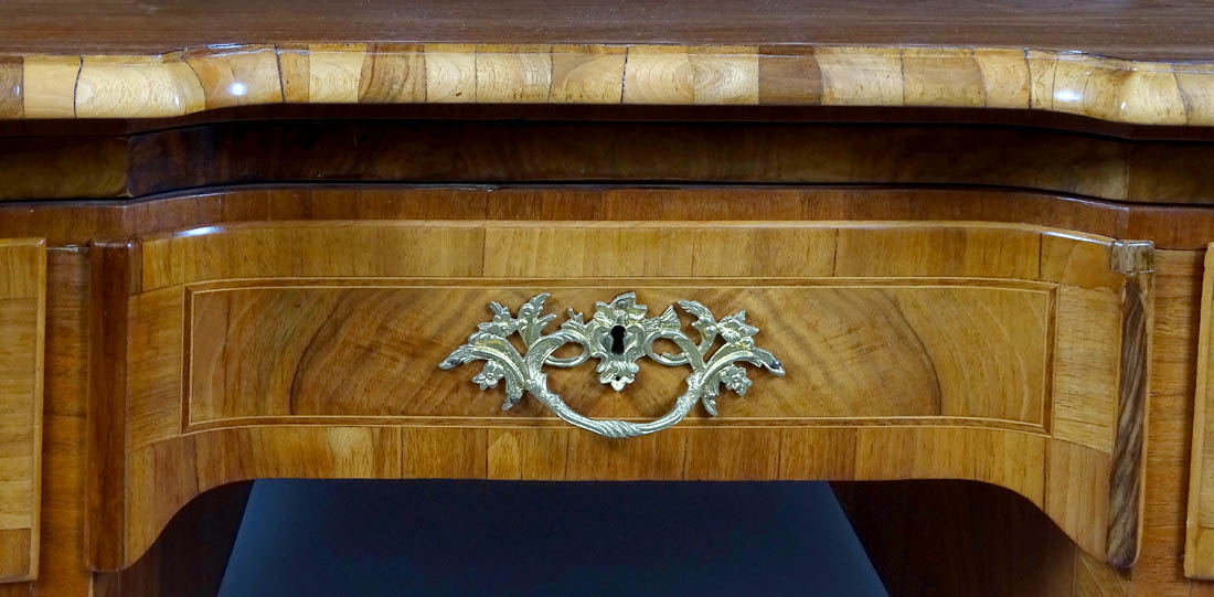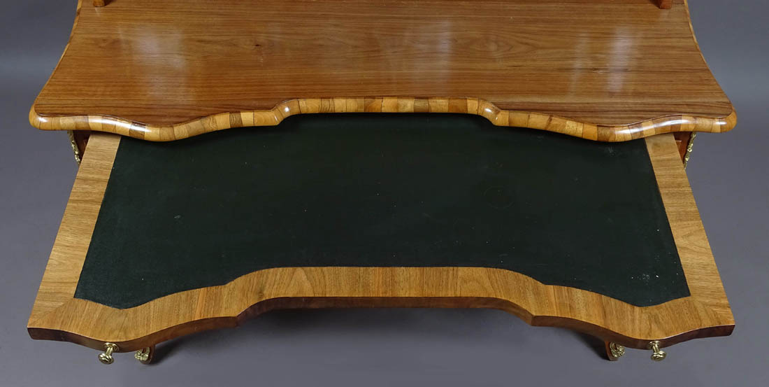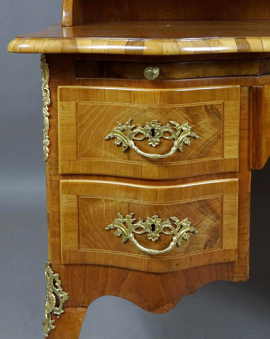 A Dresden-style desk with a top section, straight sides and a curved front, supported by four cabriole legs, decorated with openwork brass appliqués on both fronts. The top section has a wavy frame and four drawers, two on each side, closed in the center by a pair of curved doors with a lock and key. At the bottom are two drawers on each side with a rounded face, brass drawer pulls and a recessed steel lock, and one drawer with a concave front in the center. A pull-out sub-top, upholstered in dark green leather, extends beneath the main tabletop.
