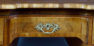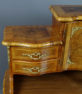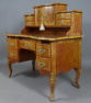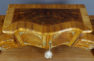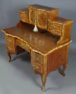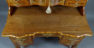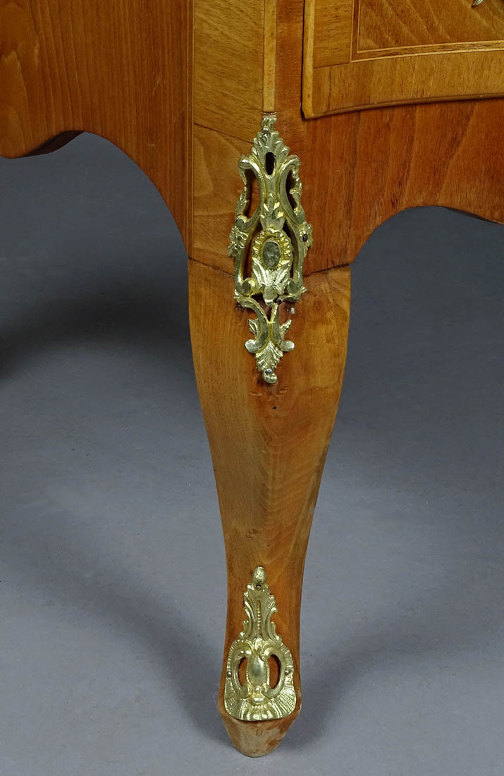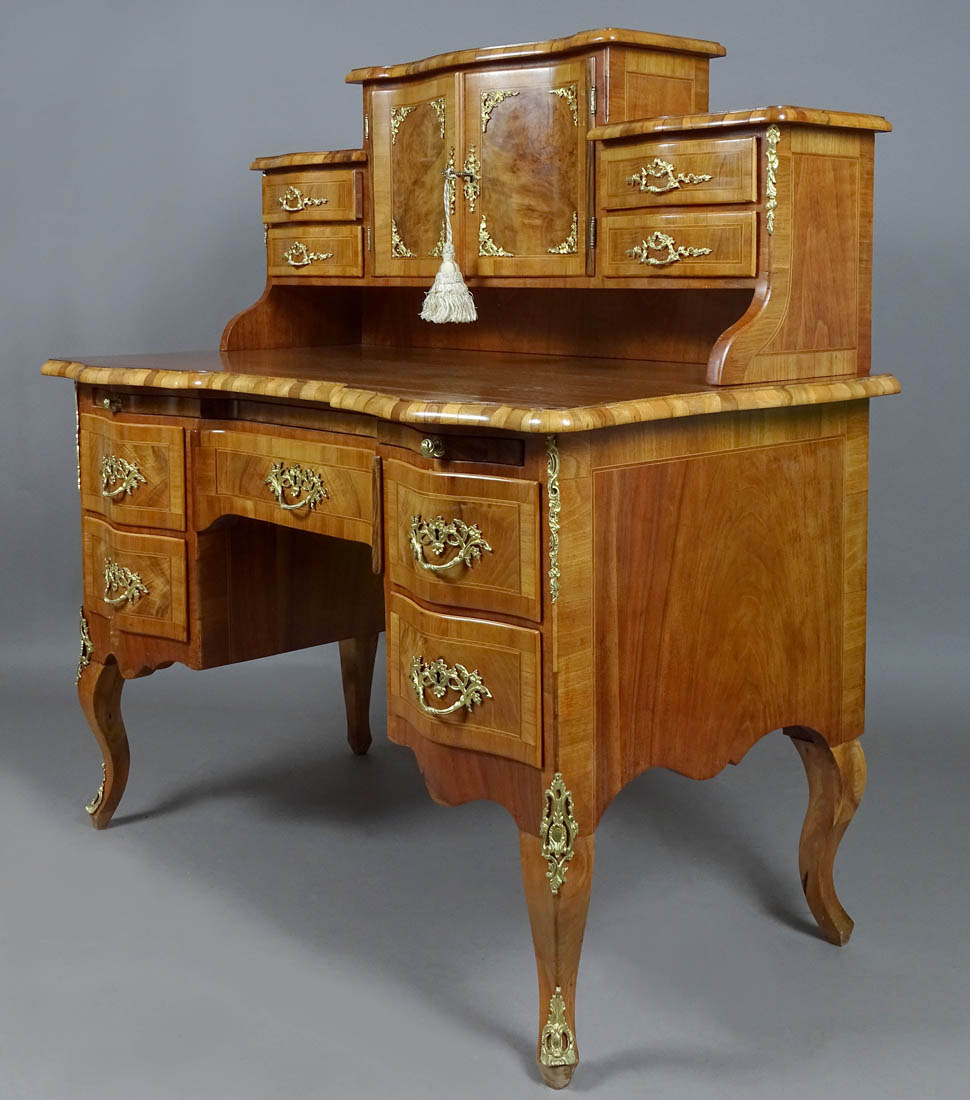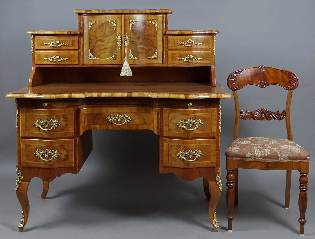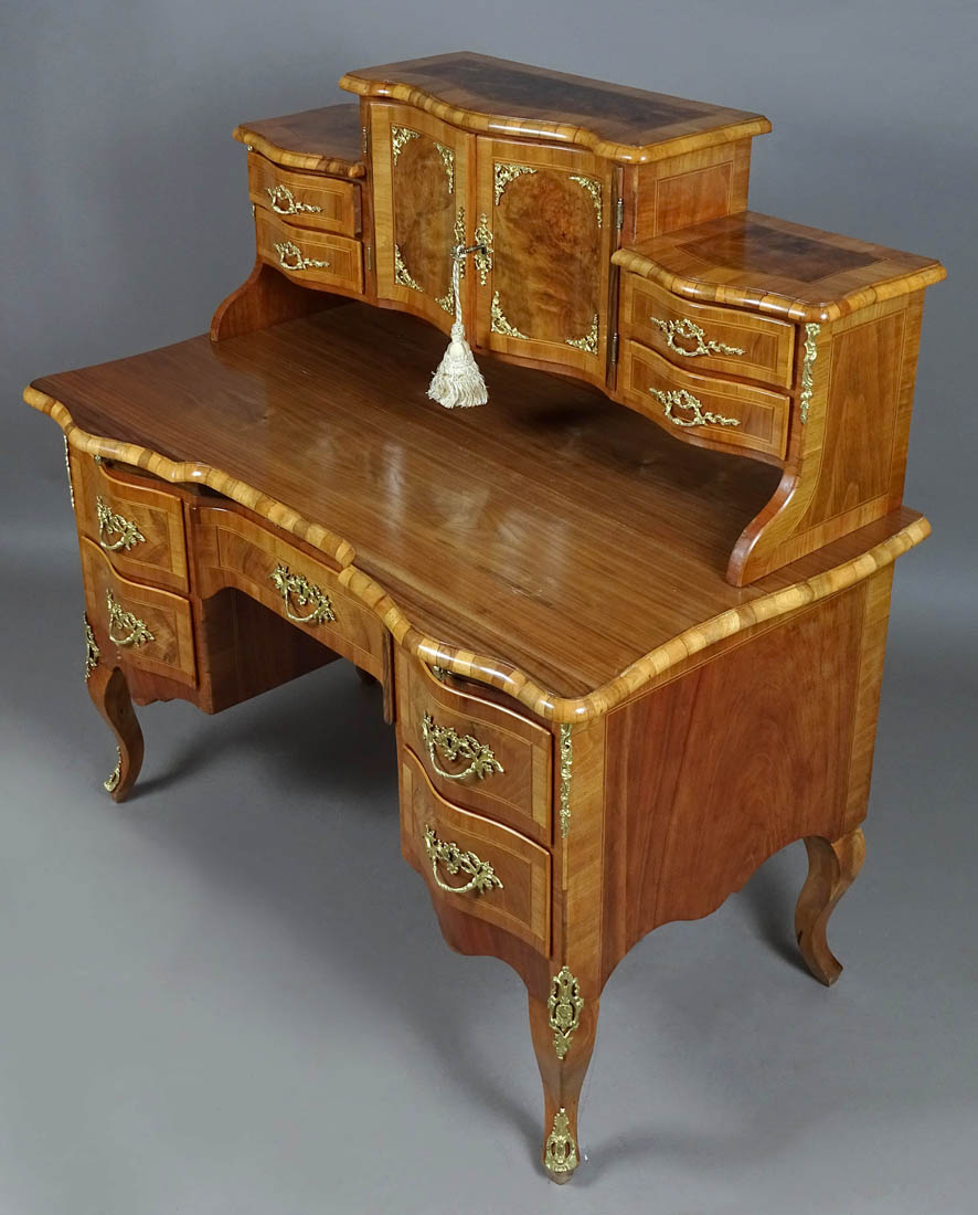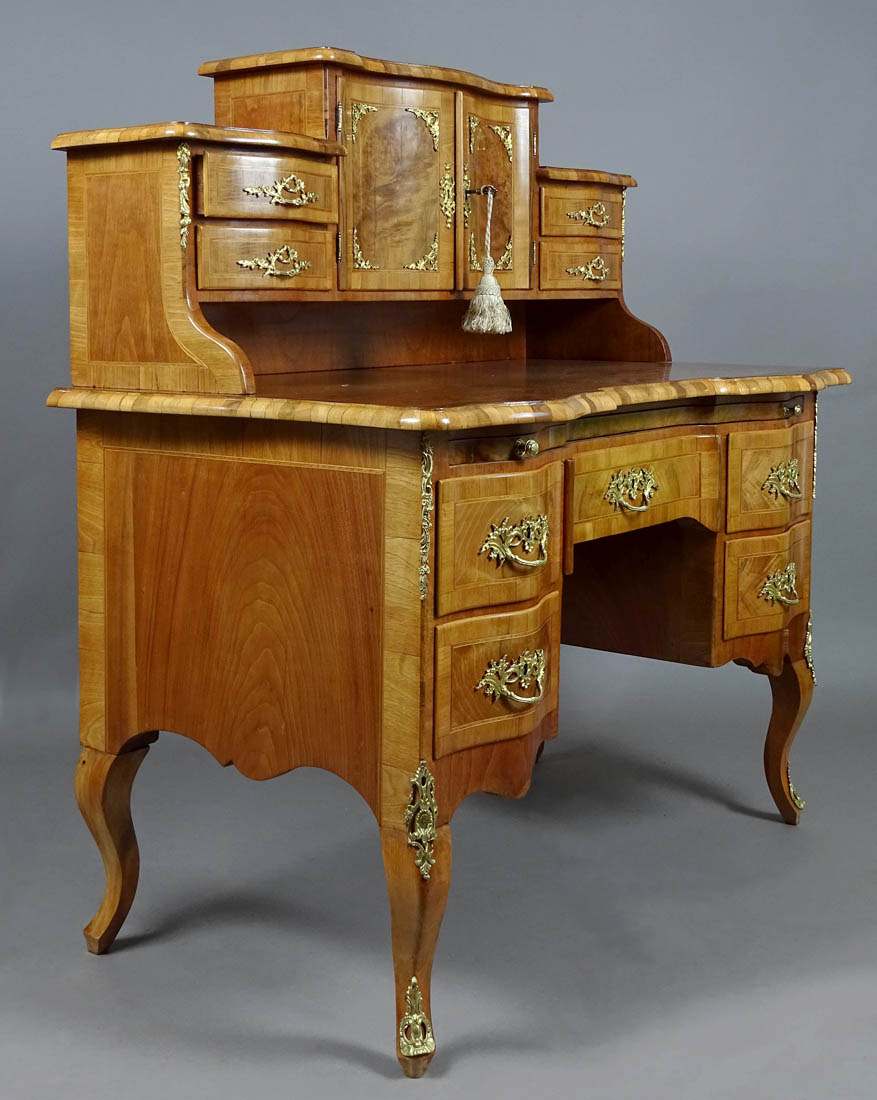 A Dresden-style desk with a top section, straight sides and a curved front, supported by four cabriole legs, decorated with openwork brass appliqués on both fronts. The top section has a wavy frame and four drawers, two on each side, closed in the center by a pair of curved doors with a lock and key. At the bottom are two drawers on each side with a rounded face, brass drawer pulls and a recessed steel lock, and one drawer with a concave front in the center. A pull-out sub-top, upholstered in dark green leather, extends beneath the main tabletop.