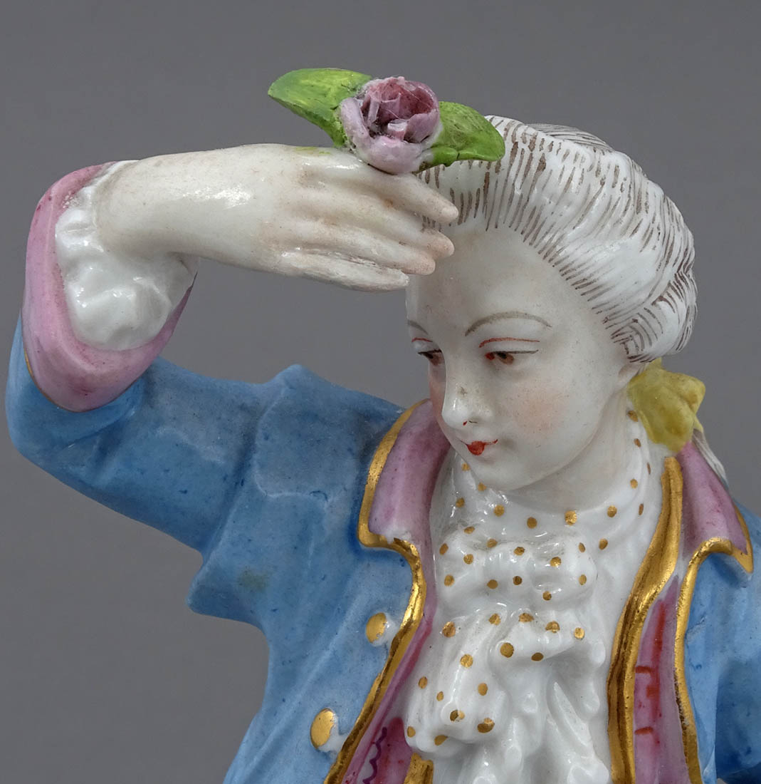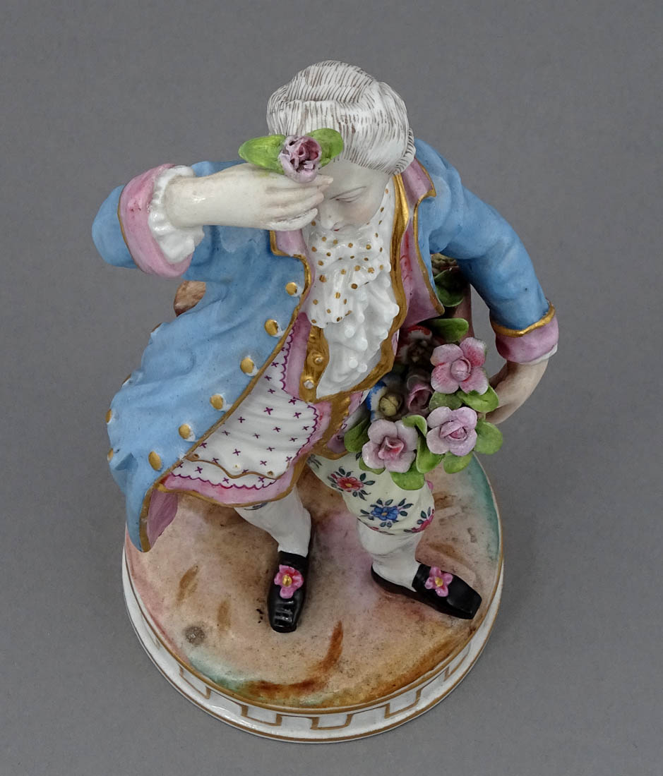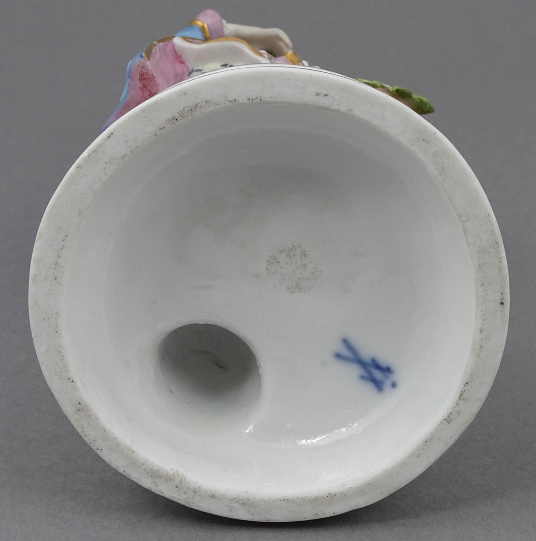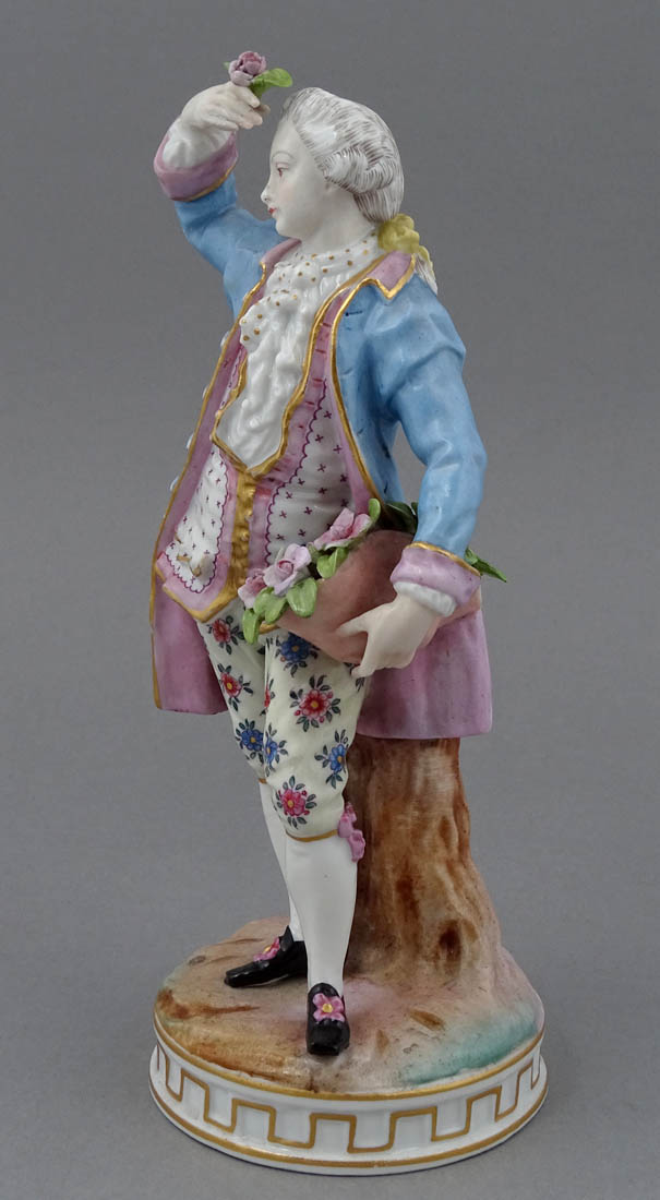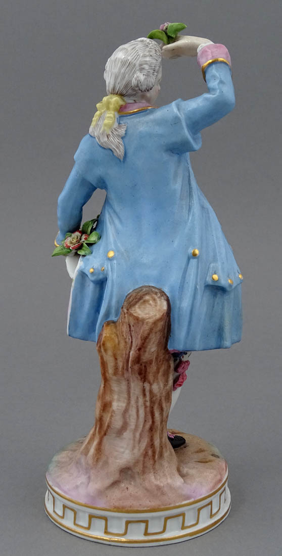 The figurine was designed by Michel Victor Acier (1736 Versailles – 1799 Dresden). Signed underglaze with cobalt in the shape of two intersecting swords. The mark of the Meissen manufactory, used from 1951 to 1953.
