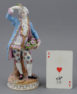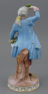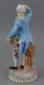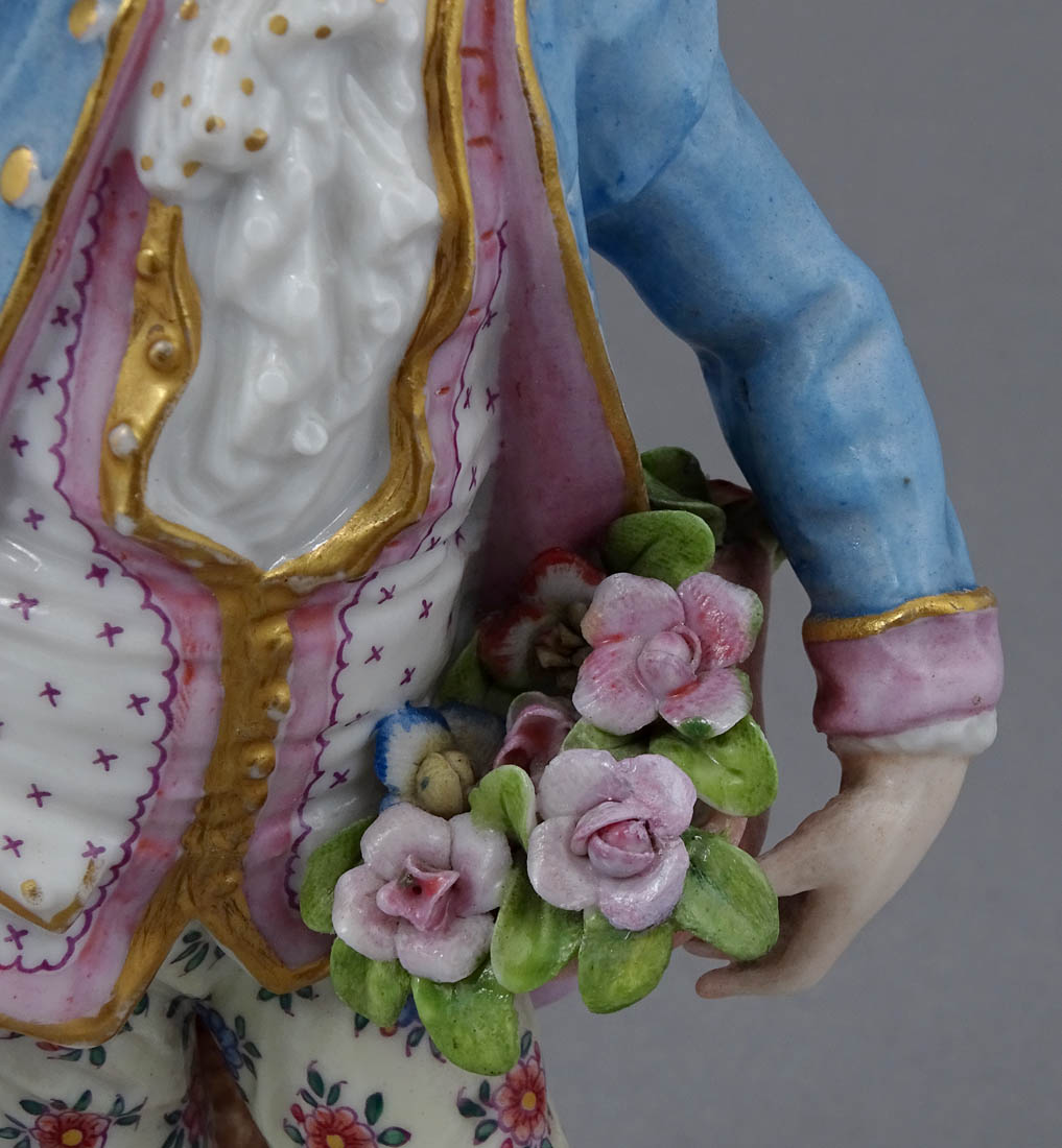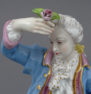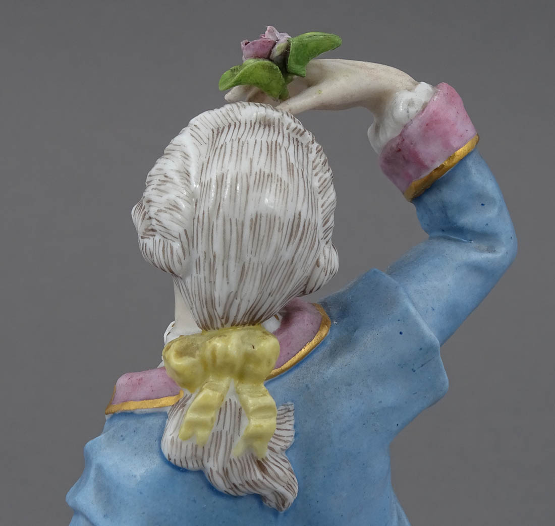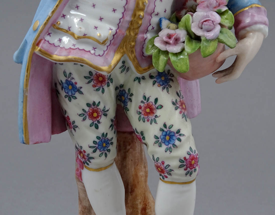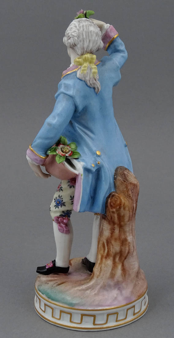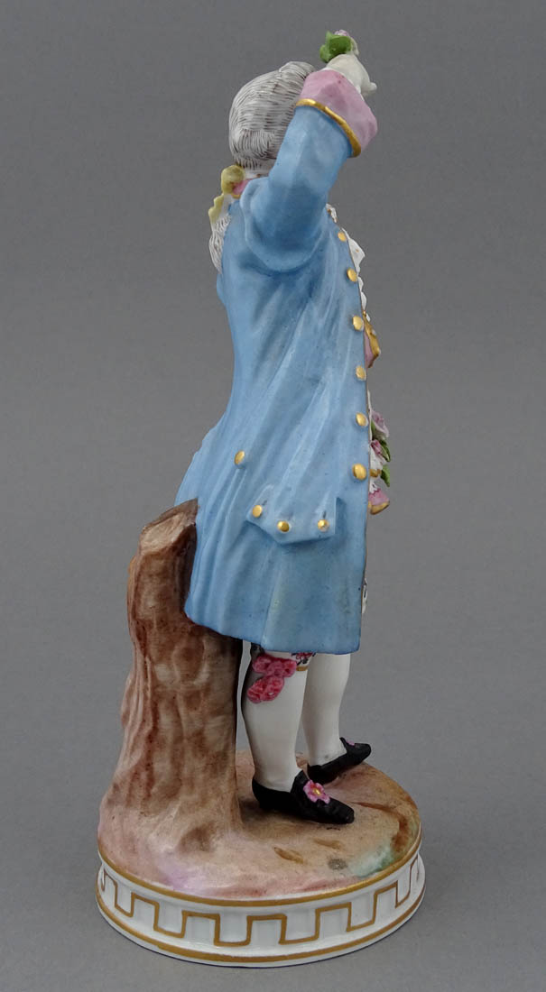 Figurine of an elegant man. The figure of an elegantly dressed man, wearing a blue coat and multicolored jacket, and black shoes, stands on a circular base leaning against a tree trunk. In his right hand, he holds a bouquet of flowers above his head, while in his left hand, a hat with flowers inside is visible.