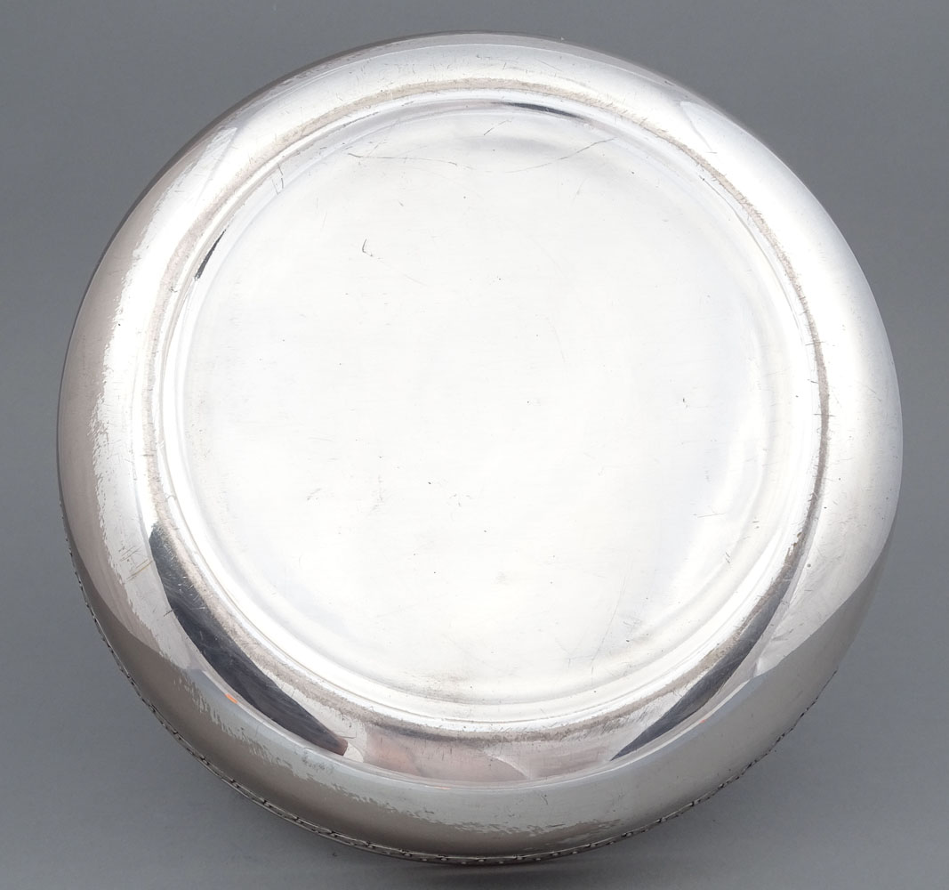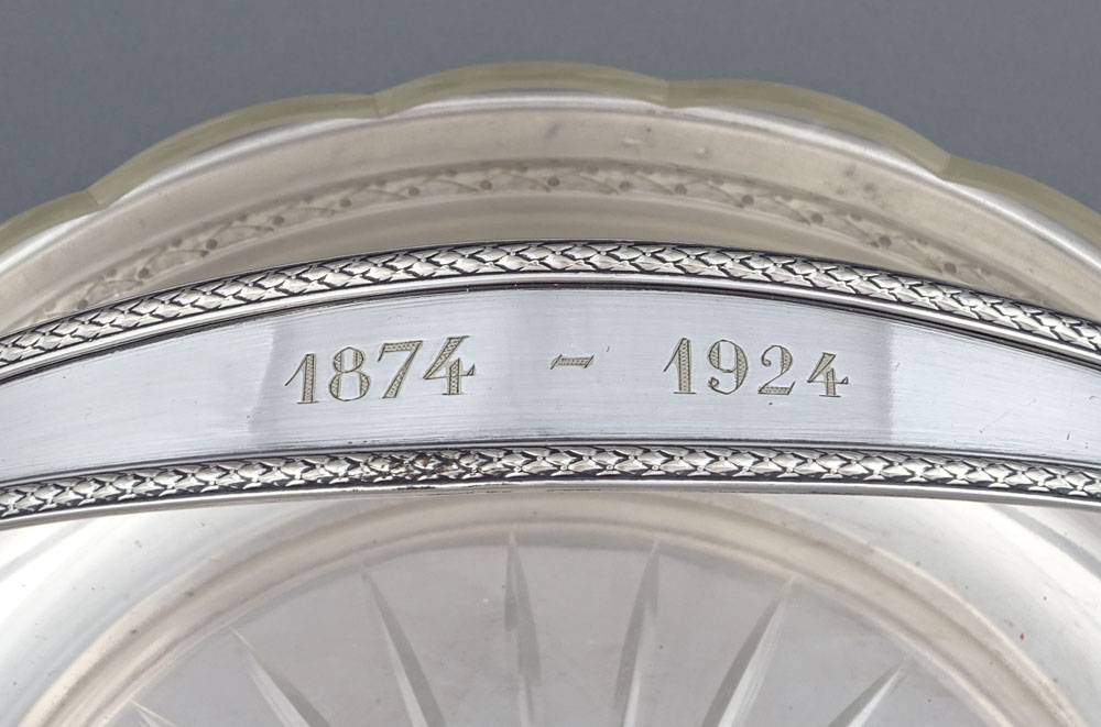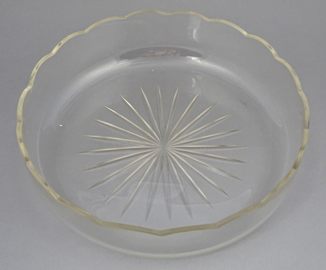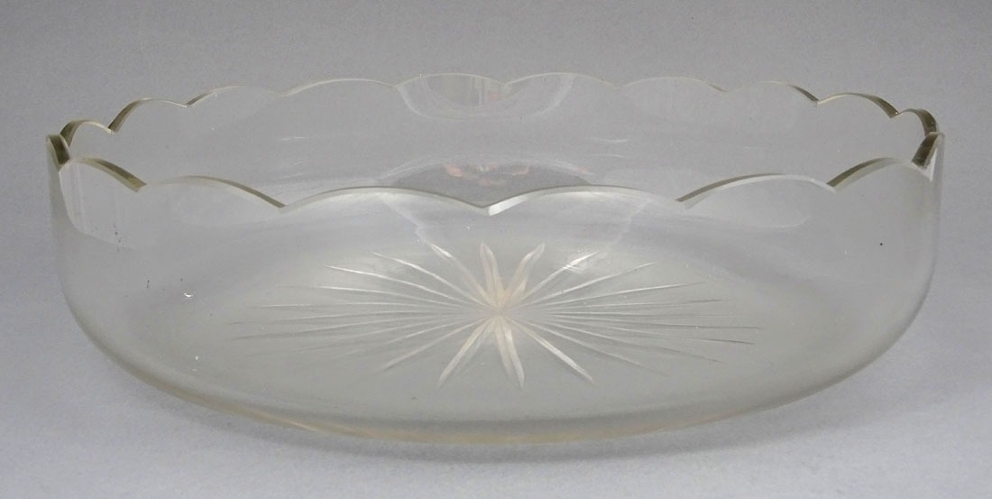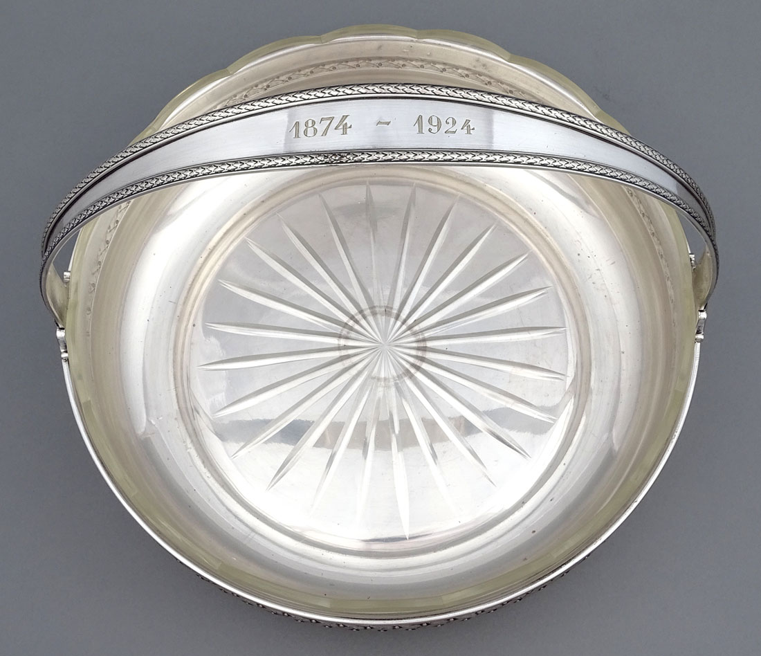 A platter with a glass insert, a round, low base, and a handle permanently attached in two places. The circumference of the lower bowl is engraved with buttons and small leaves, the handle features flower petals on both sides, and the bow features a subtle pattern replicating the base. The thick, rosette-shaped crystal insert is polished on the underside, while the collar features a contoured, arched pattern. The glass insert shows no signs of damage, the bowl is lightly worn.