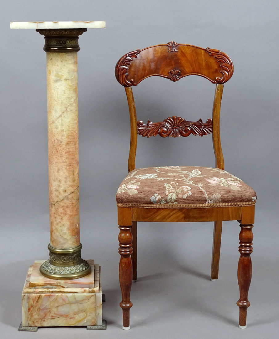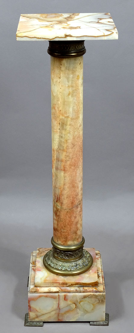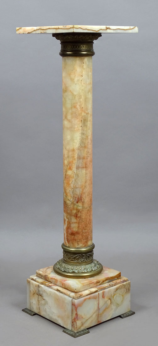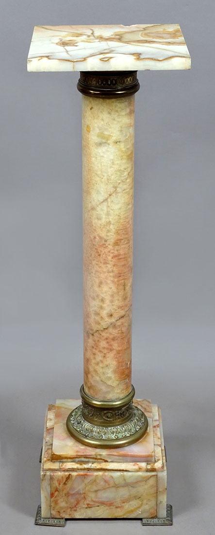 A pedestal with a massive cubic base with four bronze legs and two steps. Above, it transitions into a round, cylindrical, turned stem, at the bottom of which is a patinated bronze ring in the form of flowers and plant tendrils. At the top, a similar ring, slightly higher, is engraved with leaves and large buttons. At the top, a stone shelf is placed in a socket.