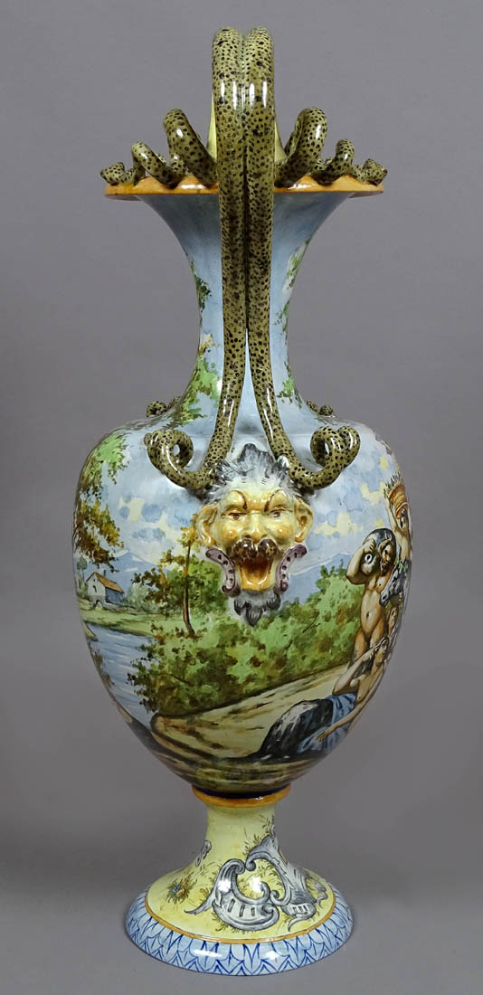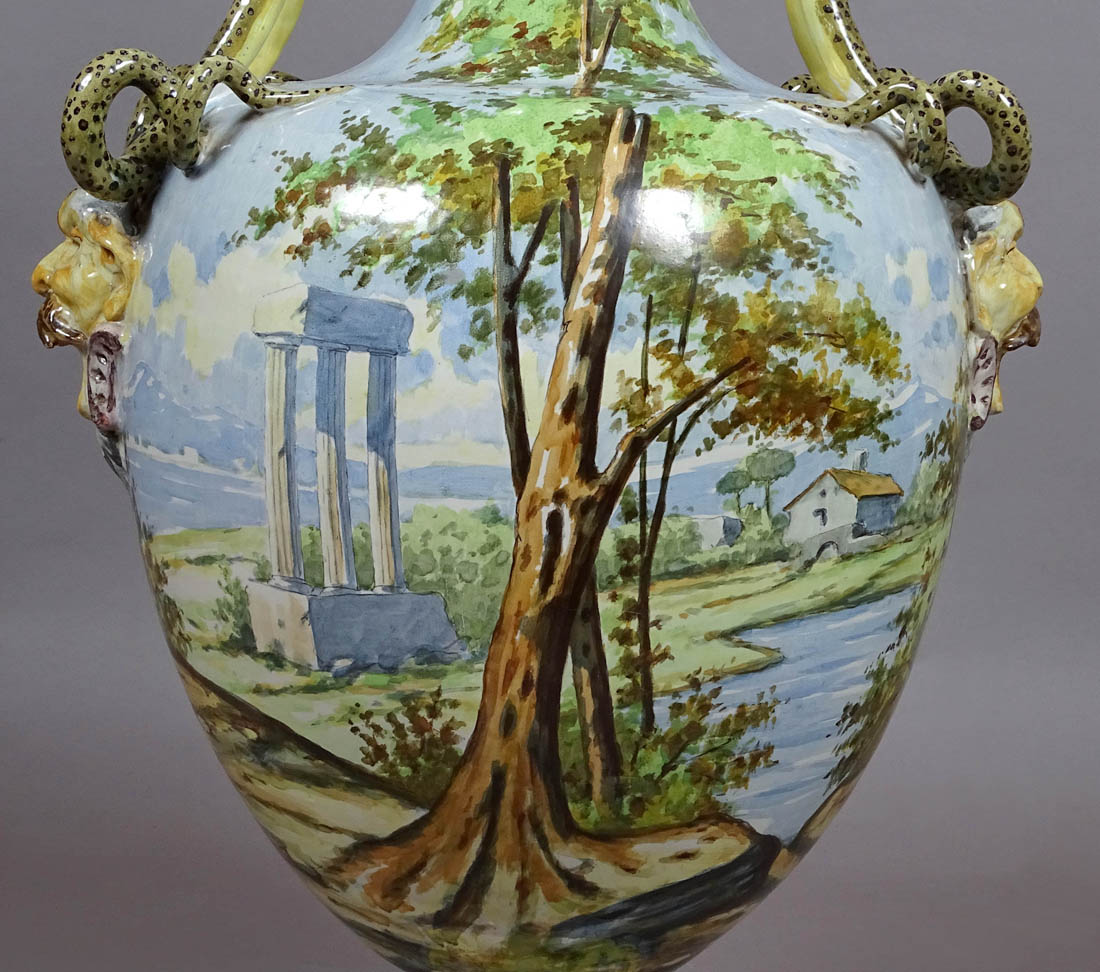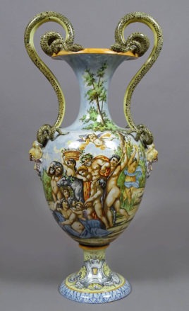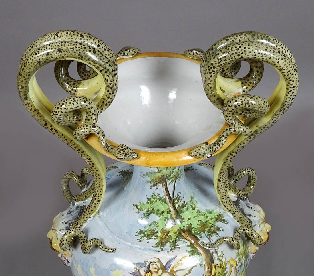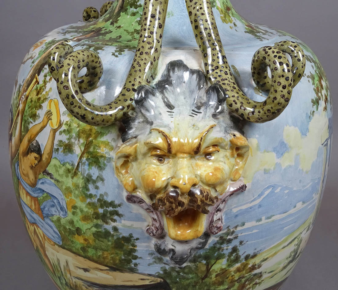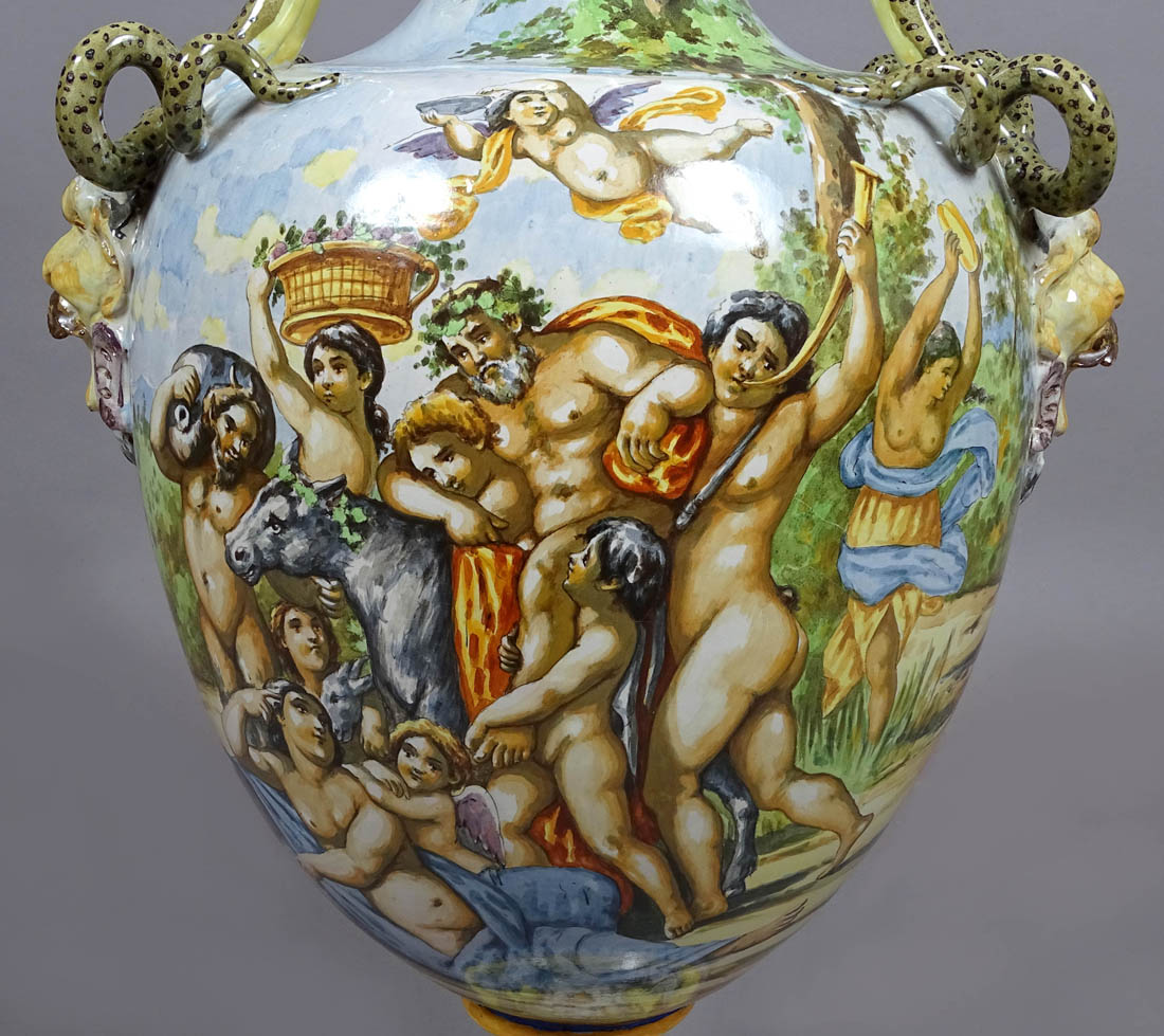 A tall Urbino-style vase, on a round, slightly arched base, narrower in the center, with a large, wide belly and a rolled-up collar at the top. The upper part features handles in the form of two winding, green and spotted snakes on each side, with their heads resting on the vase’s collar. Below the snakes are semi-plastic, colorful mascarons. The base is blue and cobalt, with rocaille motifs and a butterfly against a background of green leaves. The belly on one side depicts Bacchus with his entourage and cupids, grapes in a basket, and figures of musicians with tambourines and trumpets. On the other, trees with lush greenery and period buildings against a mountain backdrop; above, the trees transition to a tapered collar.