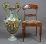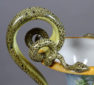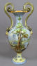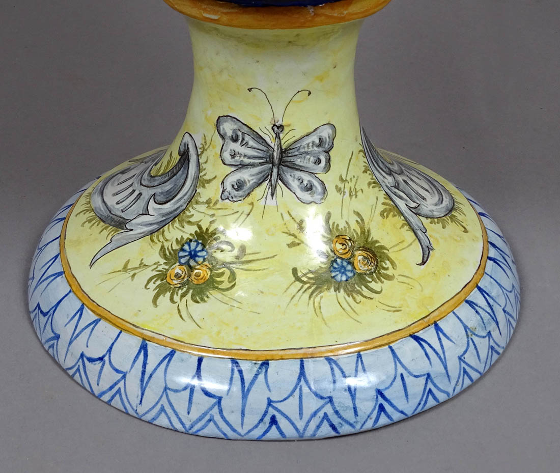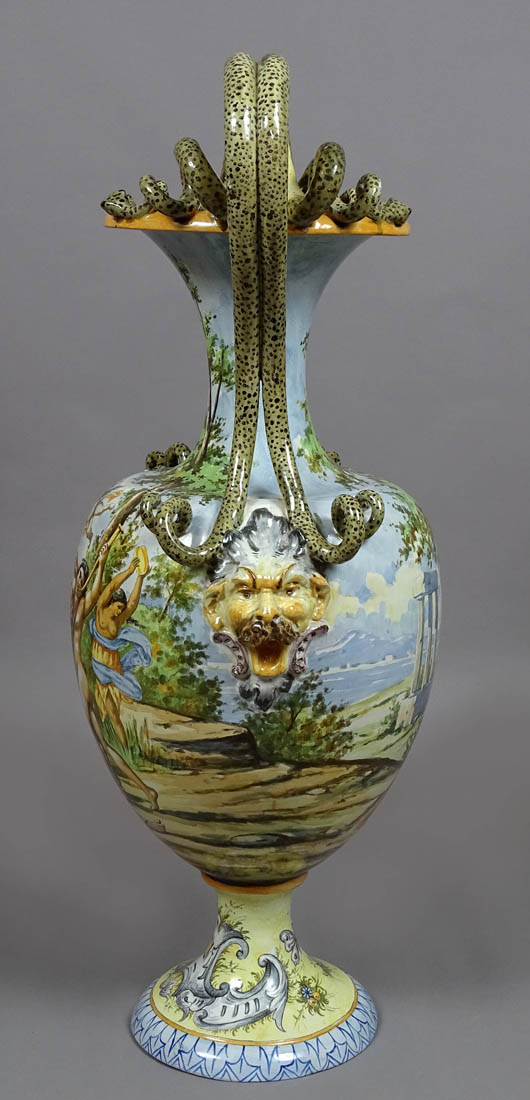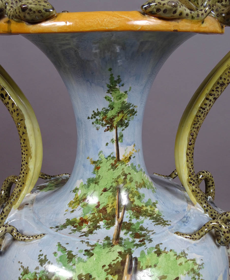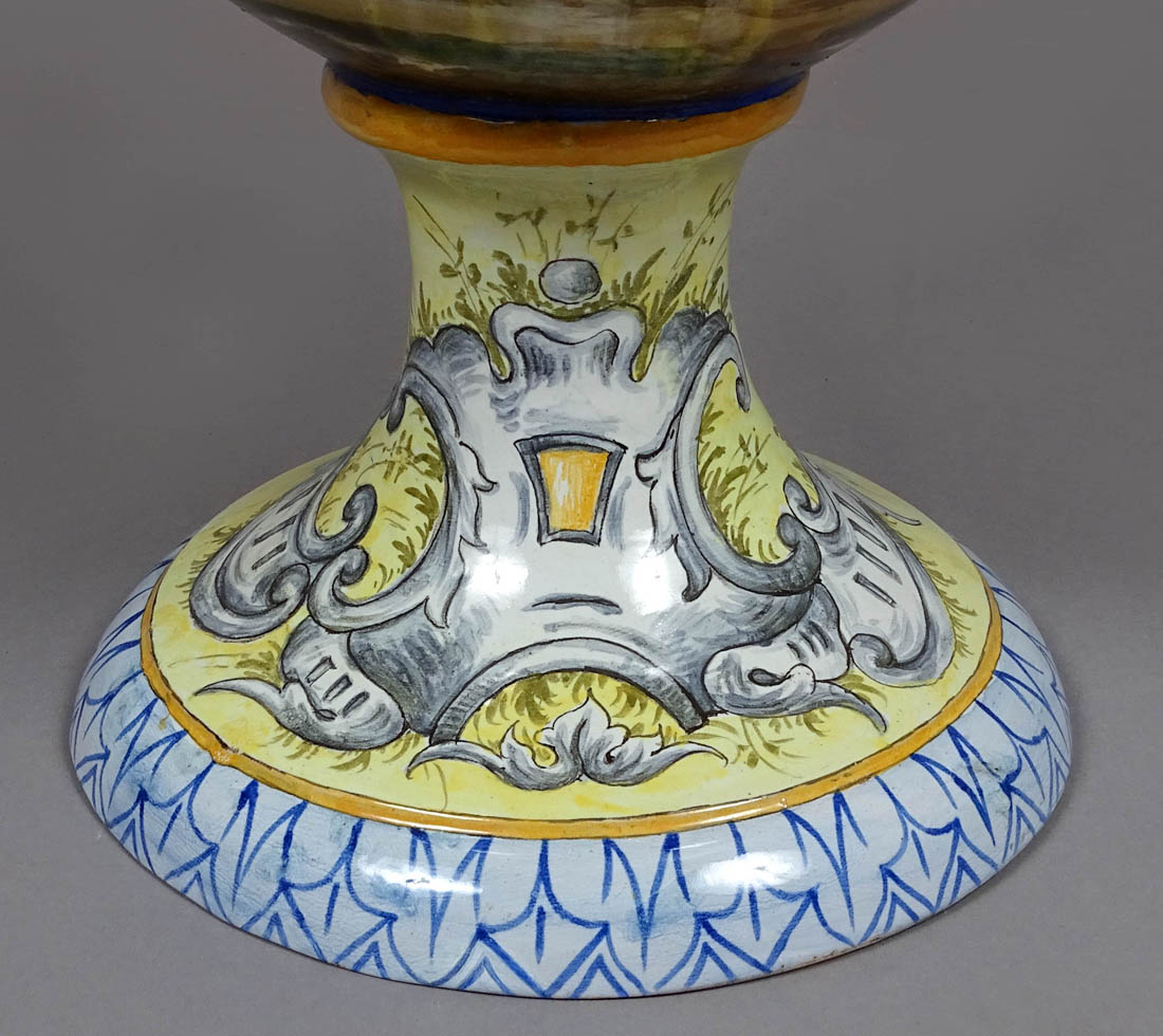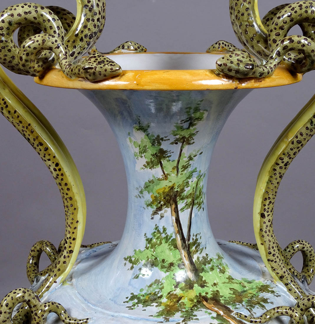 A tall Urbino-style vase, on a round, slightly arched base, narrower in the center, with a large, wide belly and a rolled-up collar at the top. The upper part features handles in the form of two winding, green and spotted snakes on each side, with their heads resting on the vase’s collar. Below the snakes are semi-plastic, colorful mascarons. The base is blue and cobalt, with rocaille motifs and a butterfly against a background of green leaves. The belly on one side depicts Bacchus with his entourage and cupids, grapes in a basket, and figures of musicians with tambourines and trumpets. On the other, trees with lush greenery and period buildings against a mountain backdrop; above, the trees transition to a tapered collar.