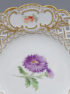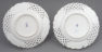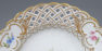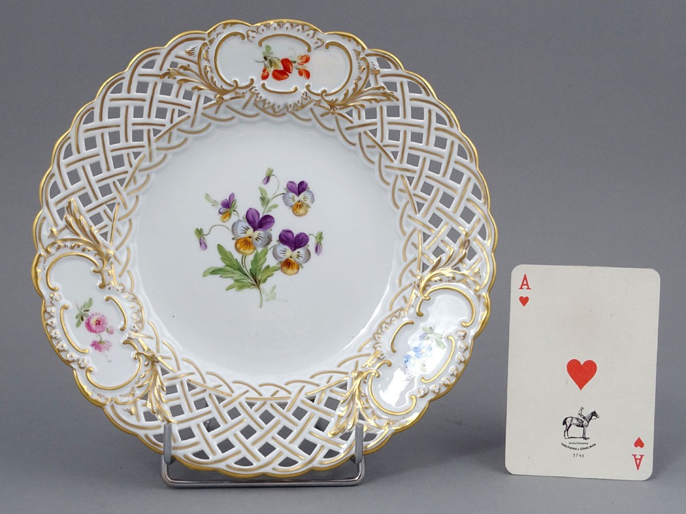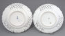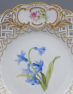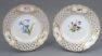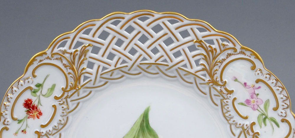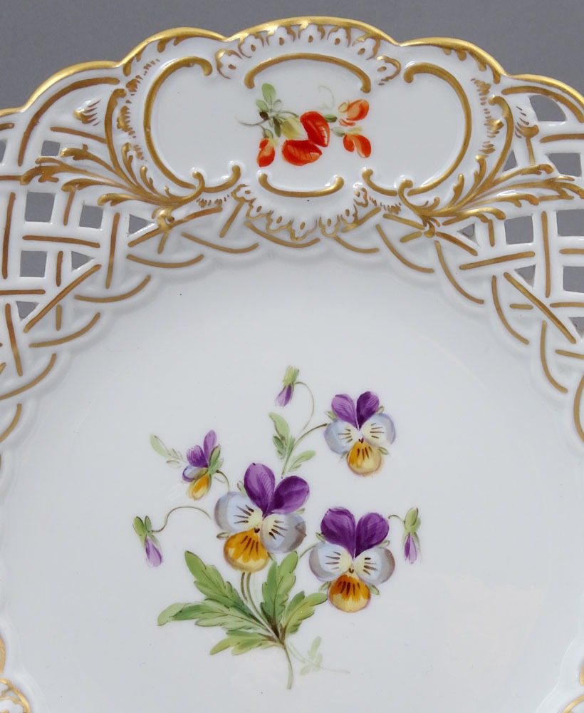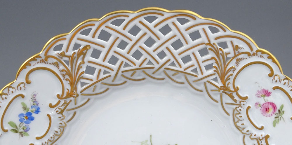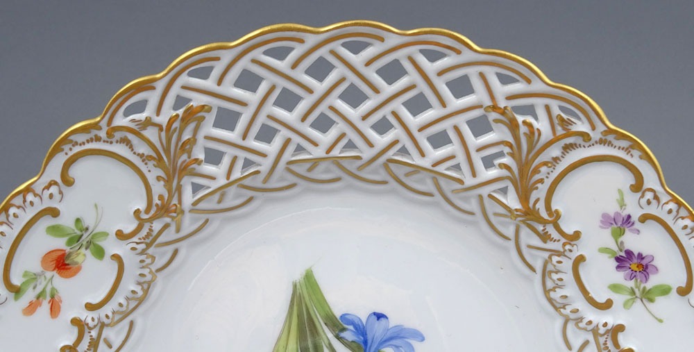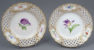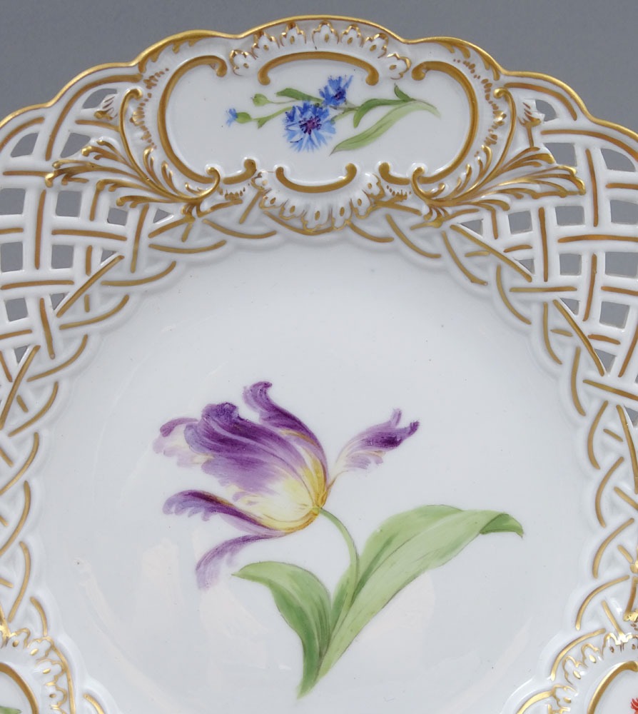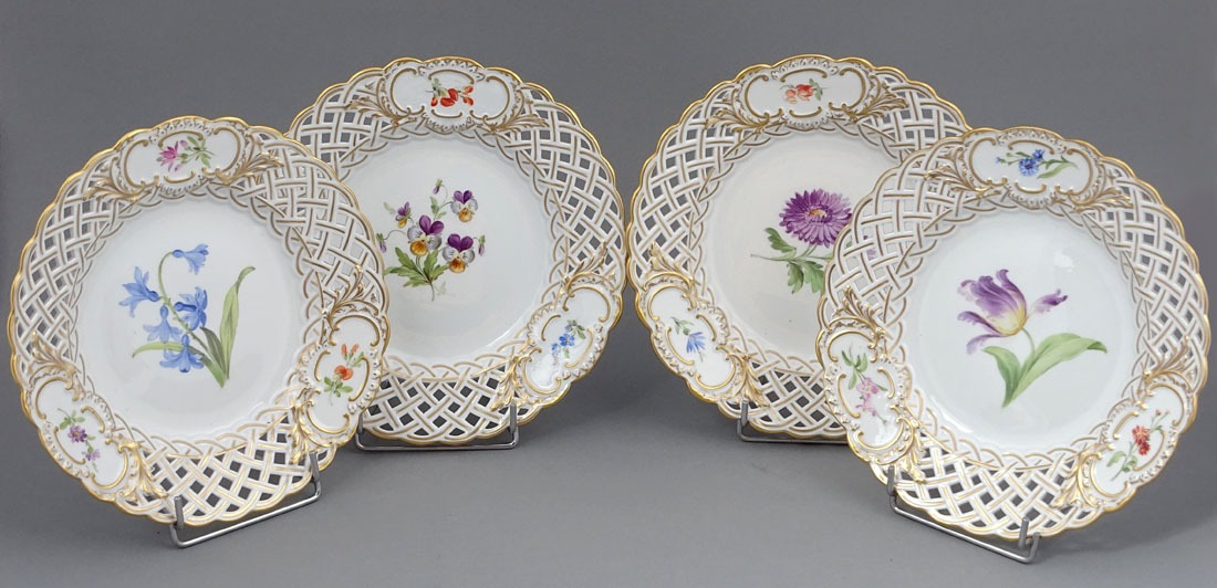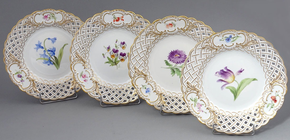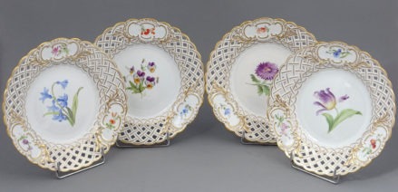 A set of four round plates with painted flowers. Each plate has an openwork collar, on which delicate flower sprigs are placed in three reserves. The collar is finished with a wavy, gilded edge. The mirror of each plate features a larger floral arrangement.