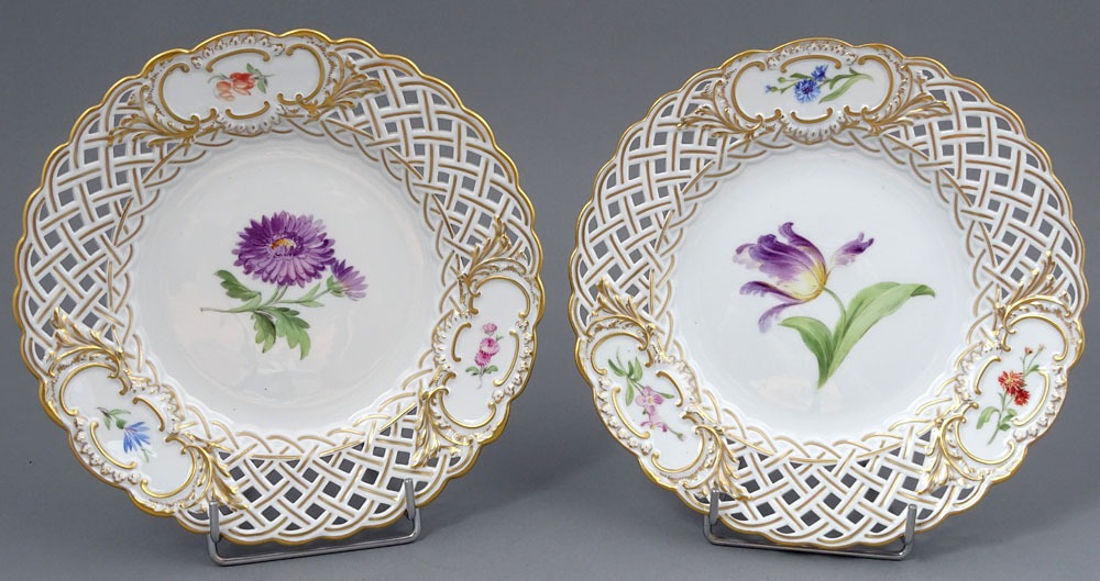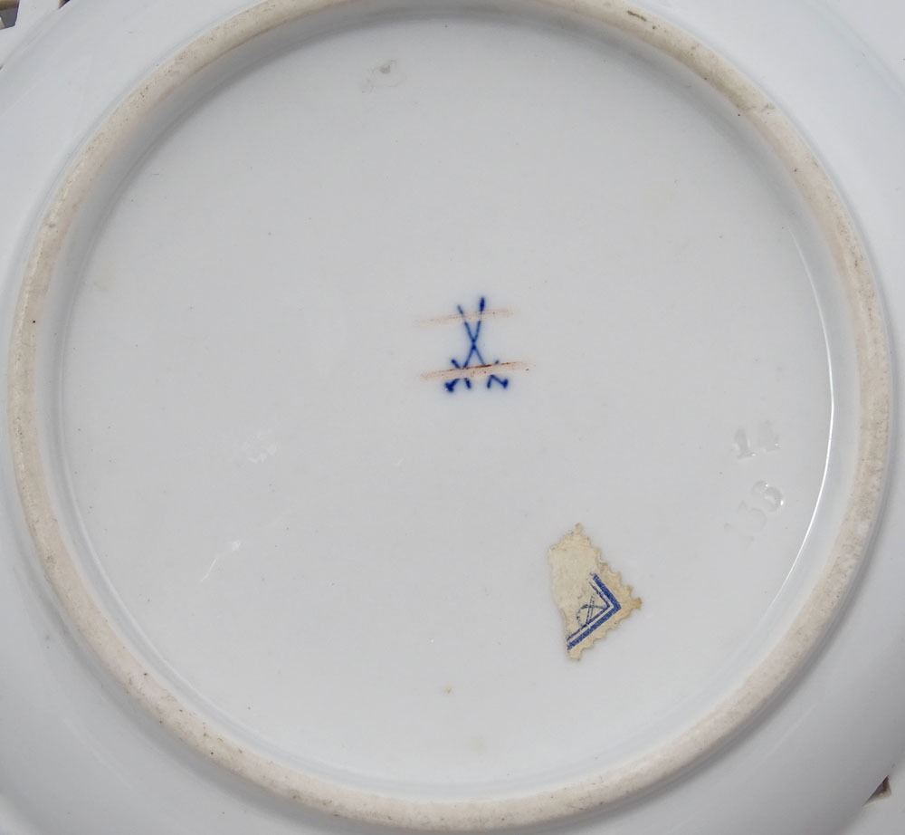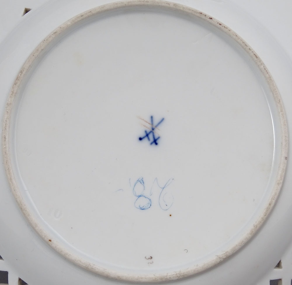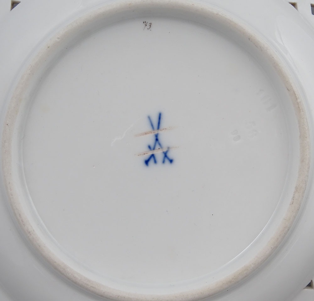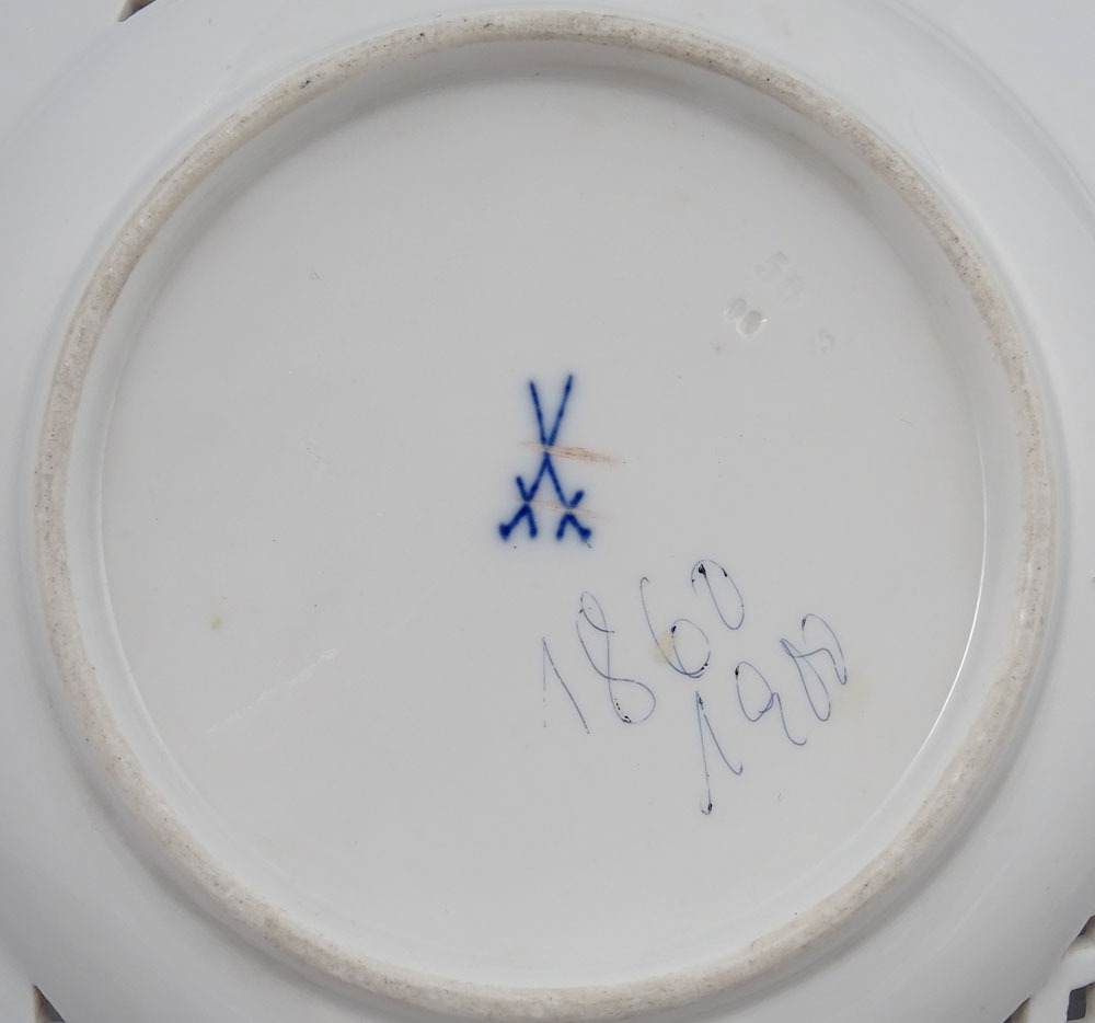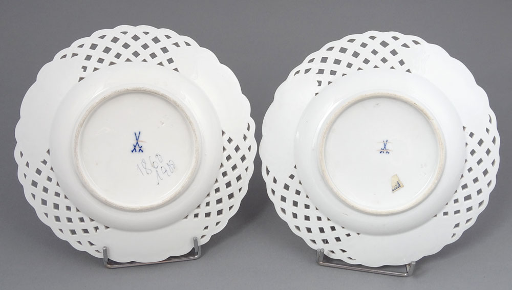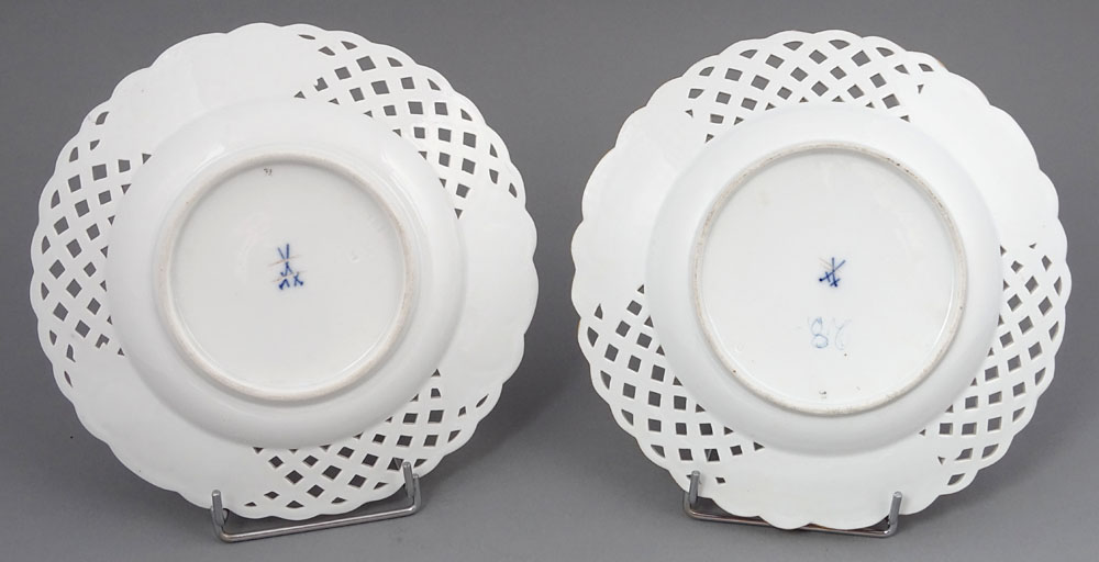 The plates are marked underglaze with two crossed swords, a Meissen mark used between 1850 and 1924.