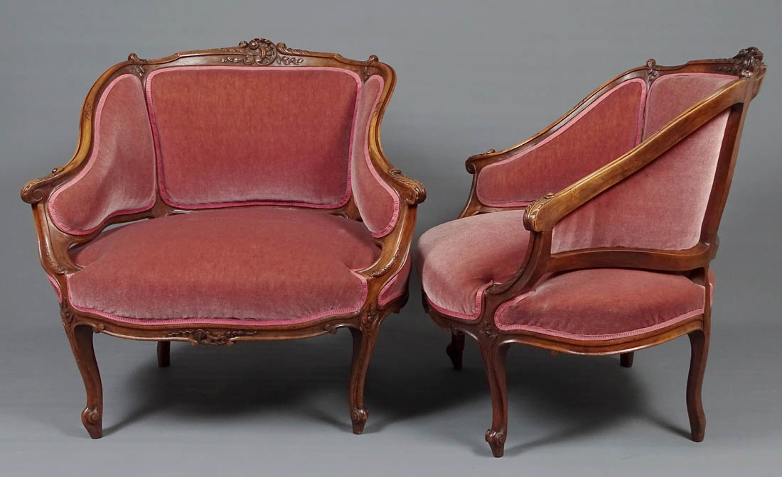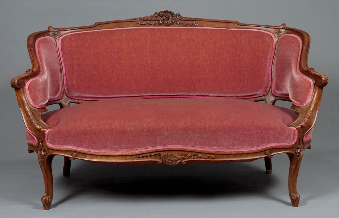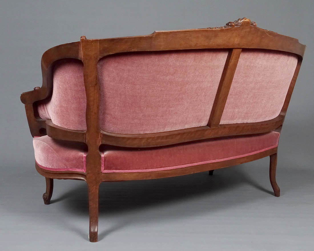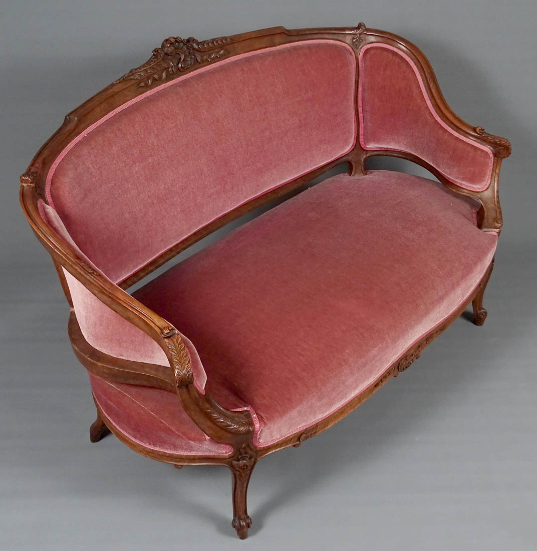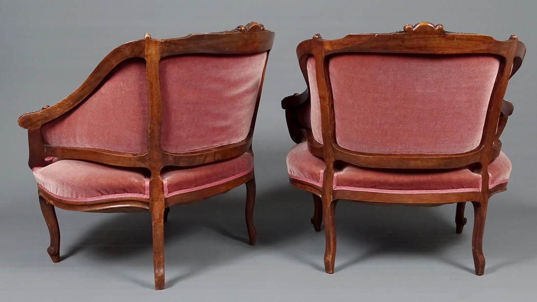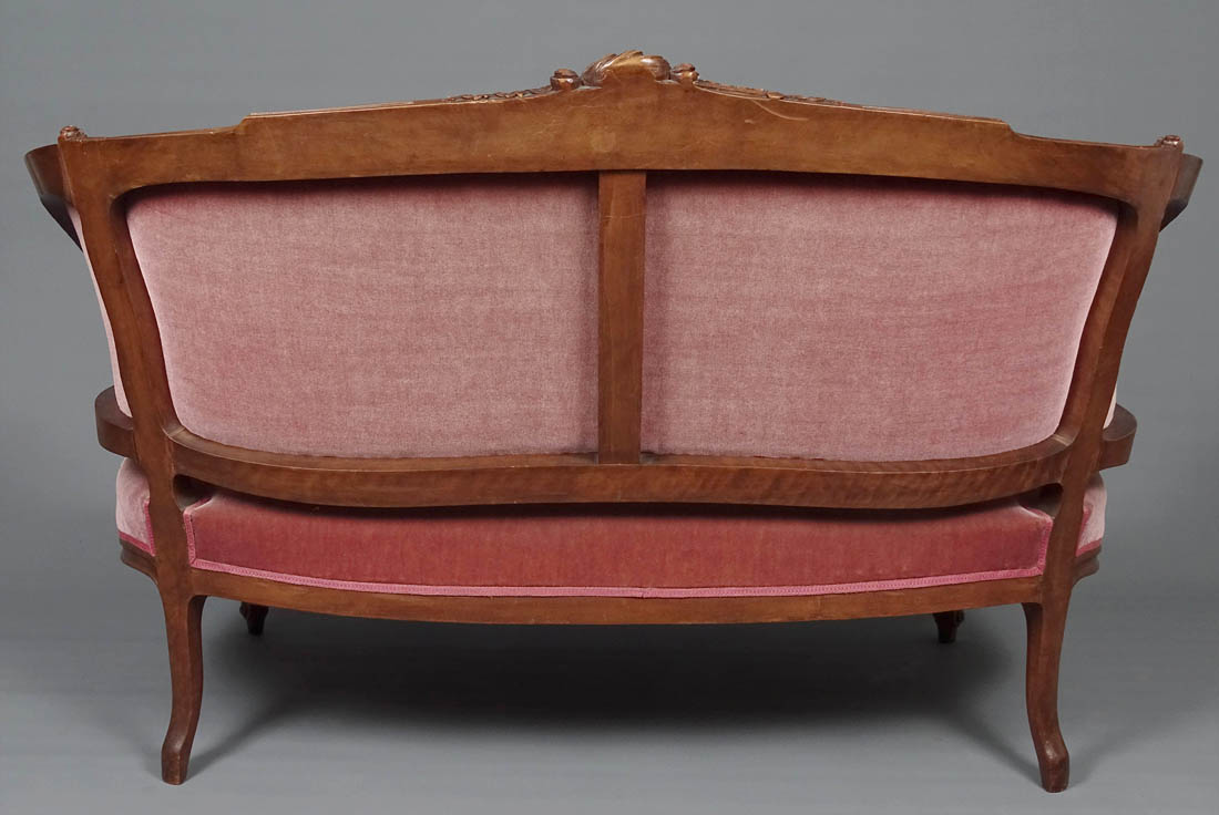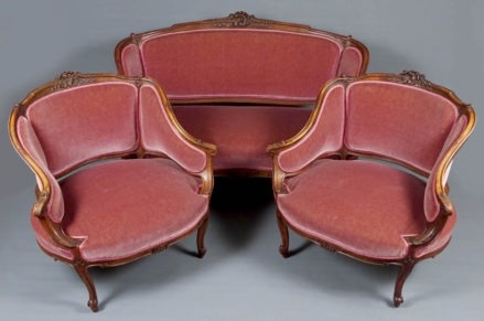 Komplet siedzisk w typie Rococo, składający się z dwóch berżer i sofy. Wszystkie elementy tapicerowane na siedzisku i oparciu, także z tyłu, materiał w dobrym stanie. Całość wsparta na czterech, delikatnie giętych nogach, przednich rzeźbionych. Snycerka także na podłokietnikach i podpórkach w formie delikatnych listków, zaś na oparciu w formie muszli, gałązek i listków. Materiał ułożony na pasach ze sprężynami.