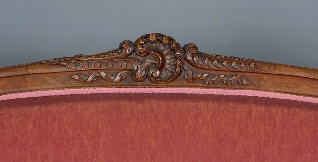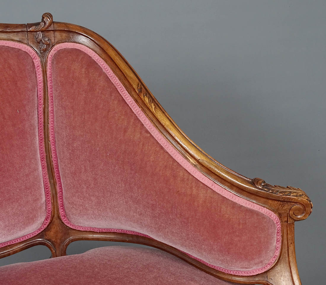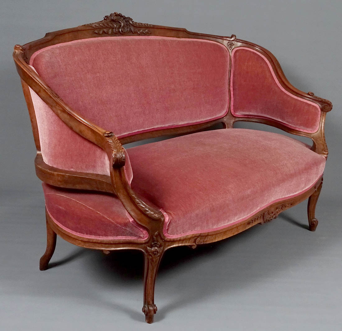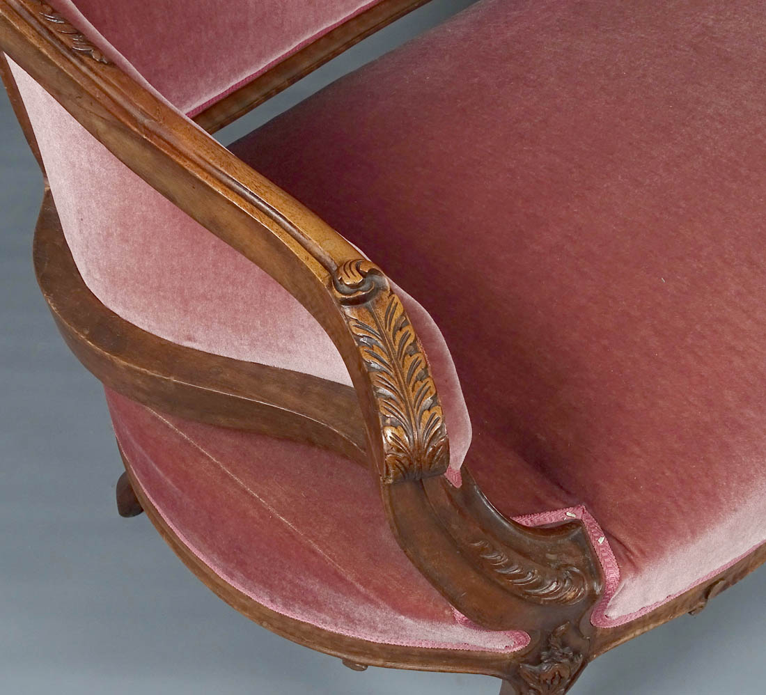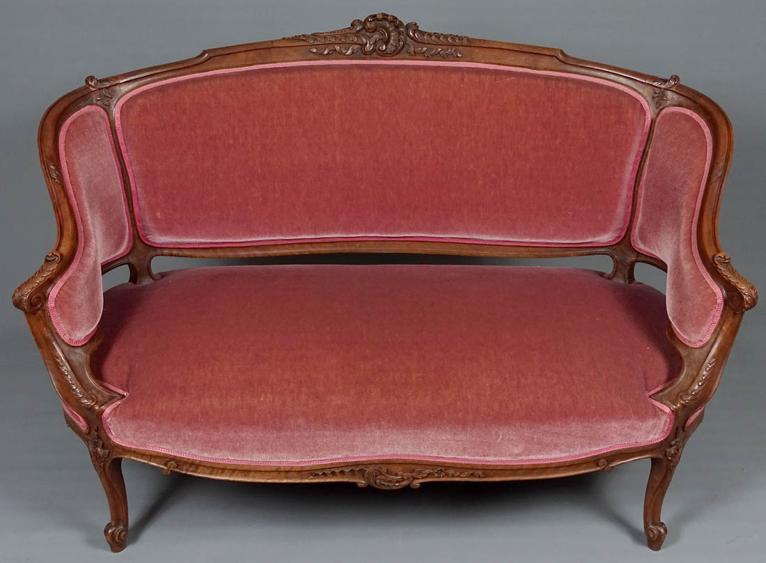 Komplet siedzisk w typie Rococo, składający się z dwóch berżer i sofy. Wszystkie elementy tapicerowane na siedzisku i oparciu, także z tyłu, materiał w dobrym stanie. Całość wsparta na czterech, delikatnie giętych nogach, przednich rzeźbionych. Snycerka także na podłokietnikach i podpórkach w formie delikatnych listków, zaś na oparciu w formie muszli, gałązek i listków. Materiał ułożony na pasach ze sprężynami.