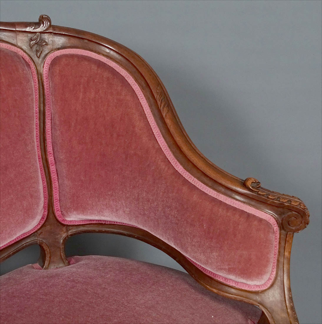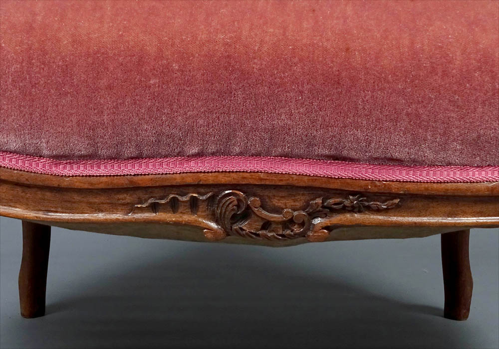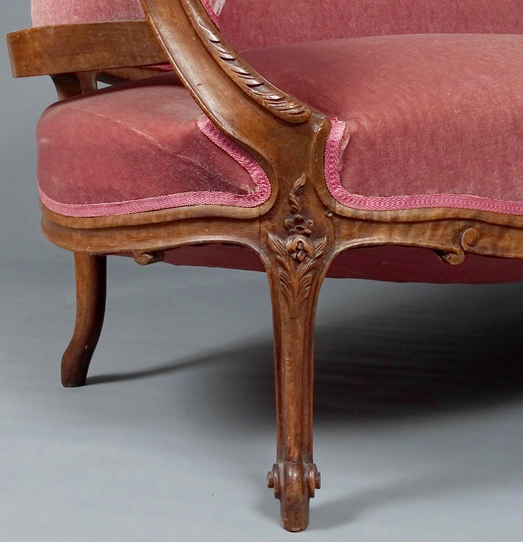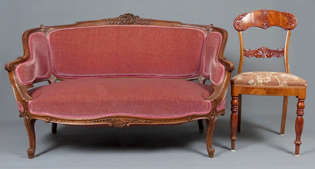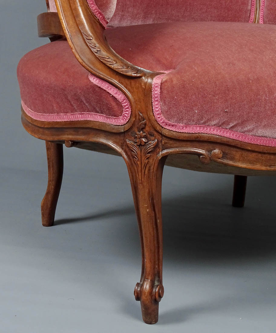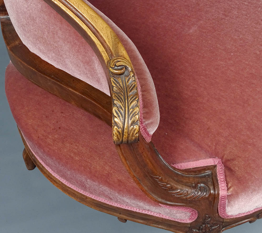 Komplet siedzisk w typie Rococo, składający się z dwóch berżer i sofy. Wszystkie elementy tapicerowane na siedzisku i oparciu, także z tyłu, materiał w dobrym stanie. Całość wsparta na czterech, delikatnie giętych nogach, przednich rzeźbionych. Snycerka także na podłokietnikach i podpórkach w formie delikatnych listków, zaś na oparciu w formie muszli, gałązek i listków. Materiał ułożony na pasach ze sprężynami.