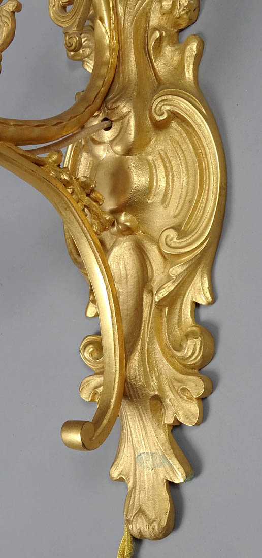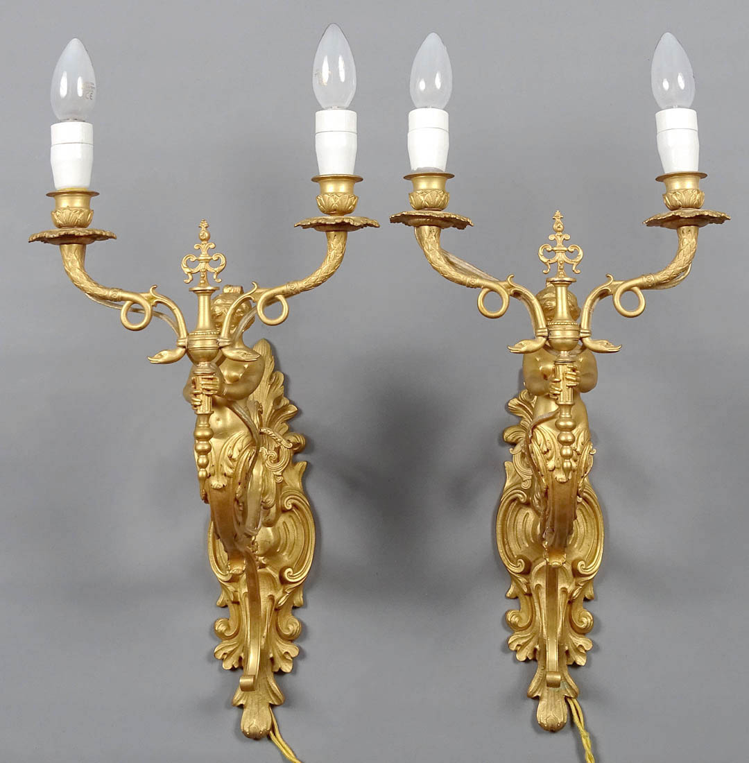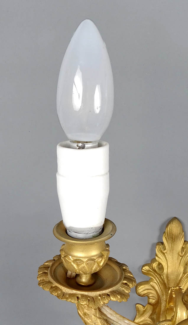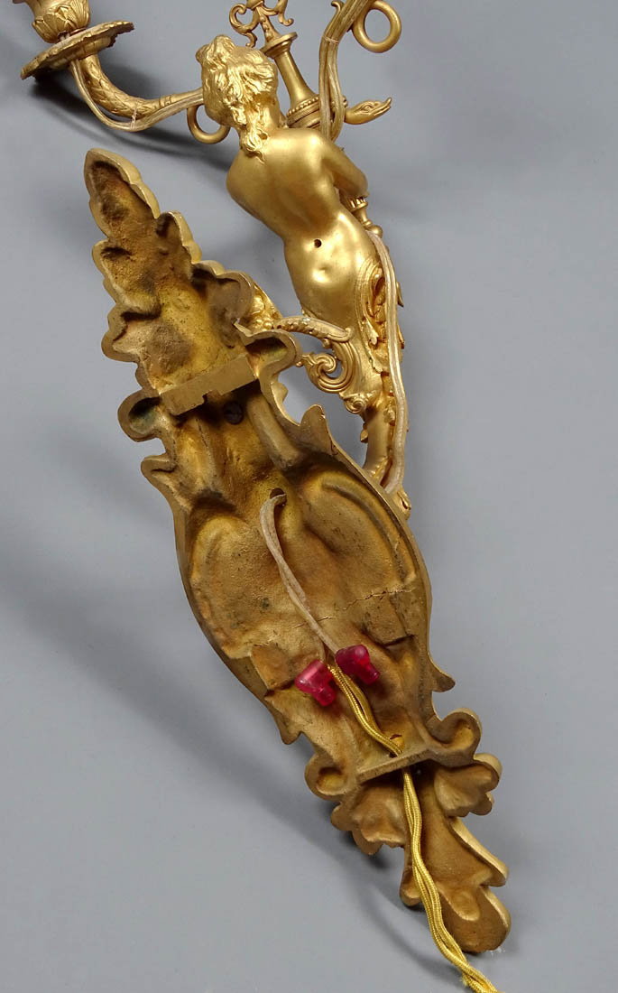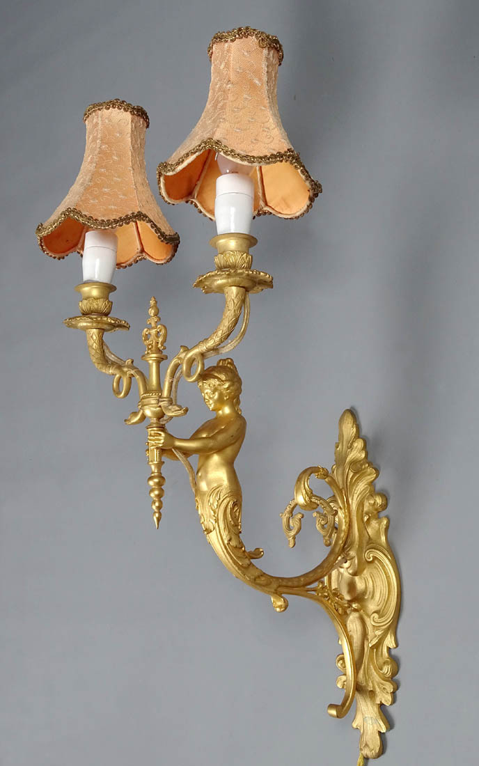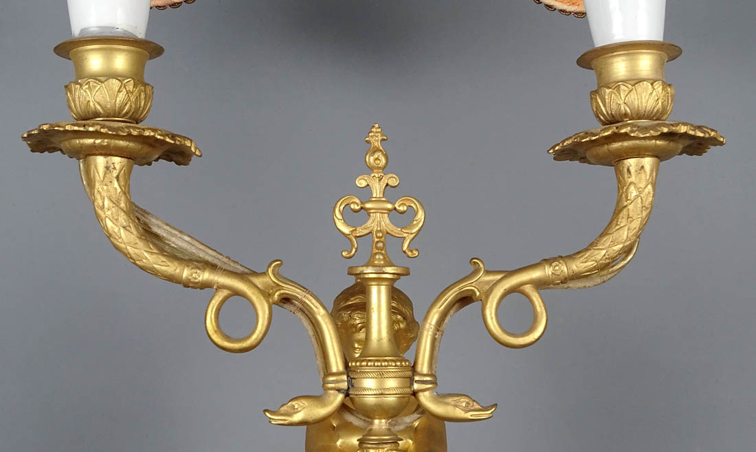 Para kinkietów w stylu Ludwika XVI, składających się z podstawy mocowanej do ściany, w postaci przeplecionych liści akantu do których przytwierdzono popiersie półnagiej kobiety. Powyżej w dłoniach niewiasta trzyma toczony trzon, od którego rozgałęziają się dwa skręcone ramiona zakończone na dole głowami łabędzi. Na górze zaś przechodzące w cyzelowaną podstawę, z kalamidką i tuleją w której umieszczono porcelanową oprawkę z żarówką, na której spoczywa mały abażur. Wszystkie elementy grawerowane z dużą dbałością o szczegóły, złocone i częściowo polerowane.
