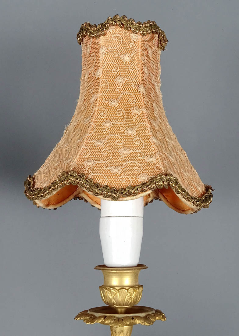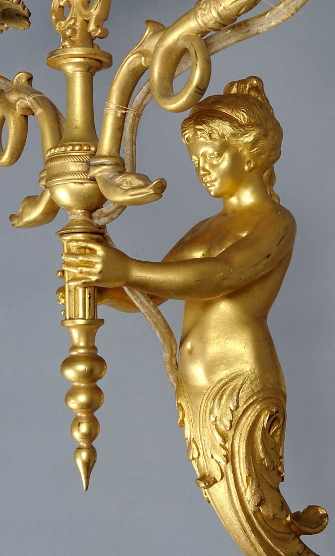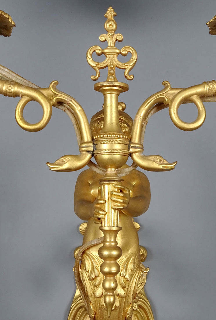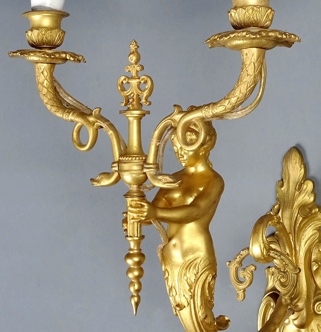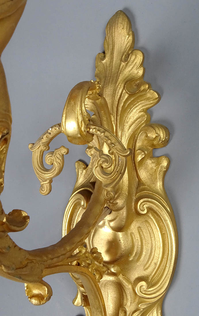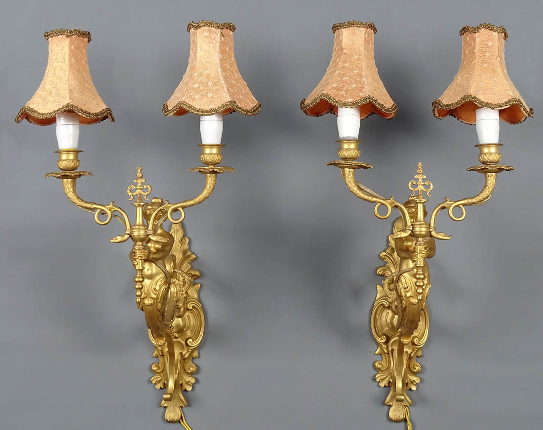 Para kinkietów w stylu Ludwika XVI, składających się z podstawy mocowanej do ściany, w postaci przeplecionych liści akantu do których przytwierdzono popiersie półnagiej kobiety. Powyżej w dłoniach niewiasta trzyma toczony trzon, od którego rozgałęziają się dwa skręcone ramiona zakończone na dole głowami łabędzi. Na górze zaś przechodzące w cyzelowaną podstawę, z kalamidką i tuleją w której umieszczono porcelanową oprawkę z żarówką, na której spoczywa mały abażur. Wszystkie elementy grawerowane z dużą dbałością o szczegóły, złocone i częściowo polerowane.