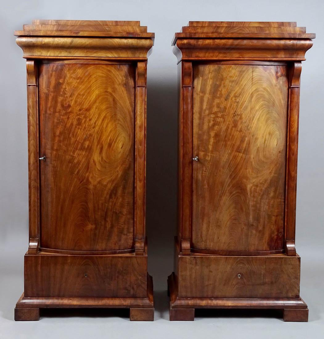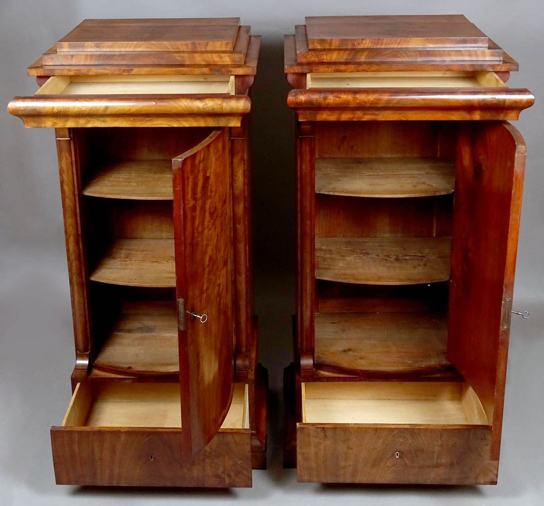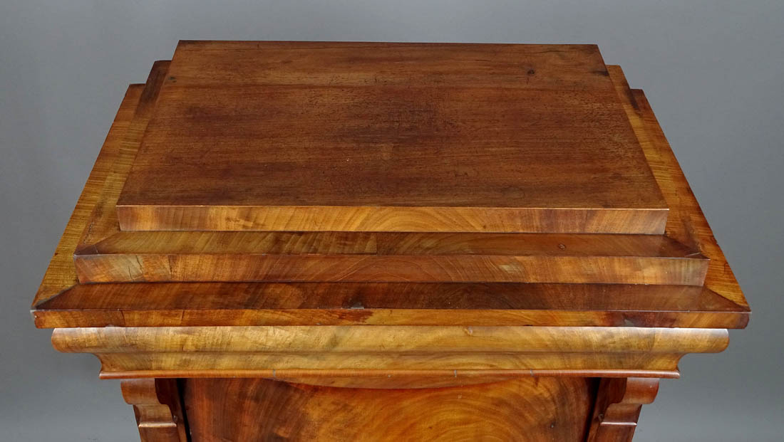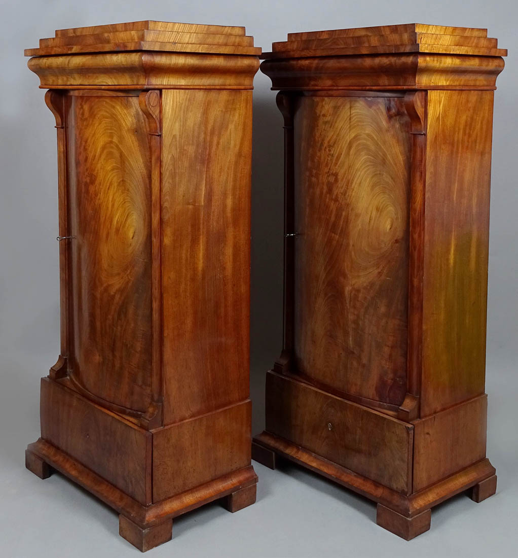 Para szafek pomocniczych – postumentów w stylu Empire. Zamykane jednym skrzydłem giętych drzwi, z dużą szufladą na dole, w obu elementach wpuszczane, stalowe zamki i klucz. Blat z trzema poziomami ułożonymi schodkowo, najmniejszym na górze, a pod nim wysuwana szuflada. Po obu stronach profilowane listwy zakończone na górze i na dole zdobnymi klockami. Całość wsparta na czterech graniastych nogach, wewnątrz dwie półki.