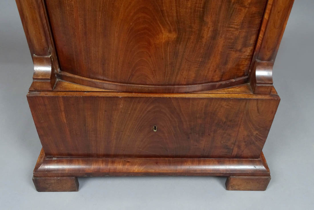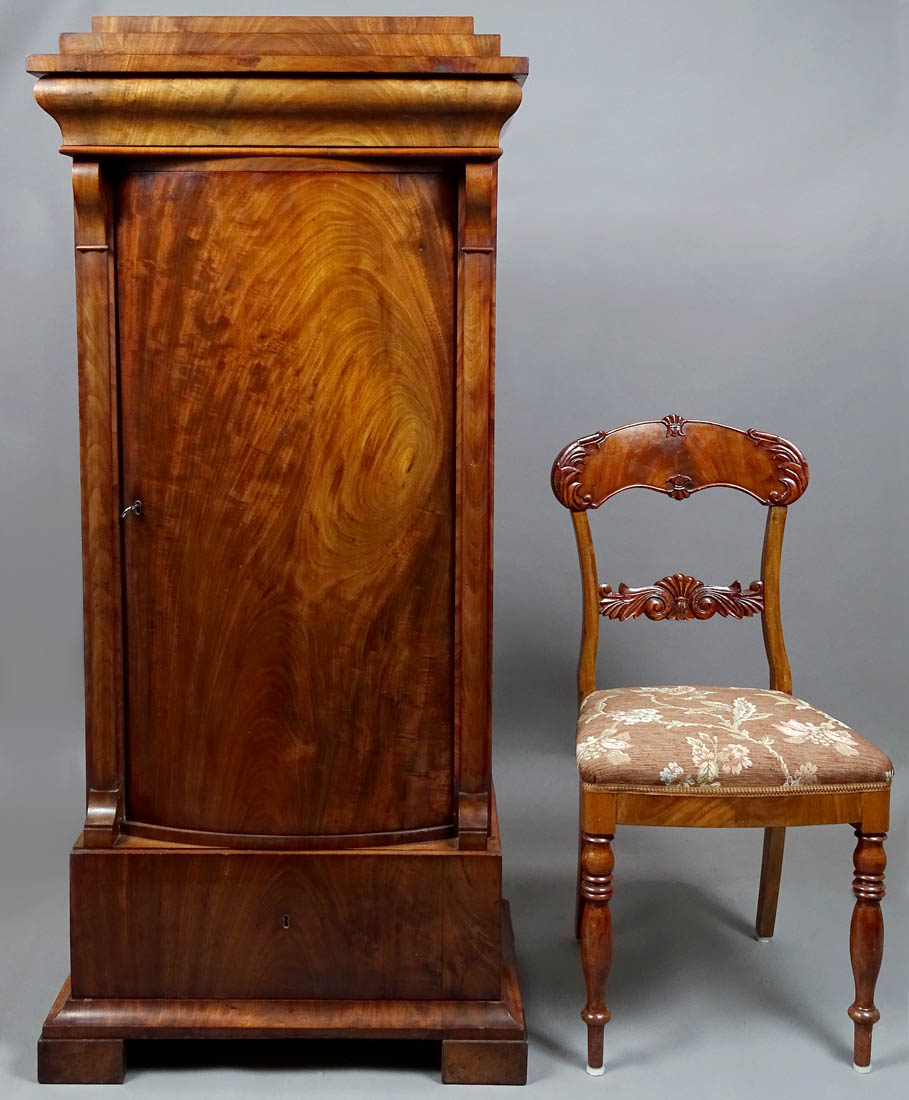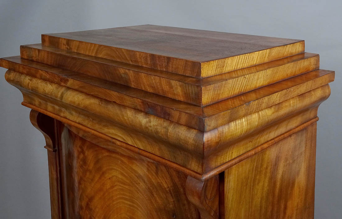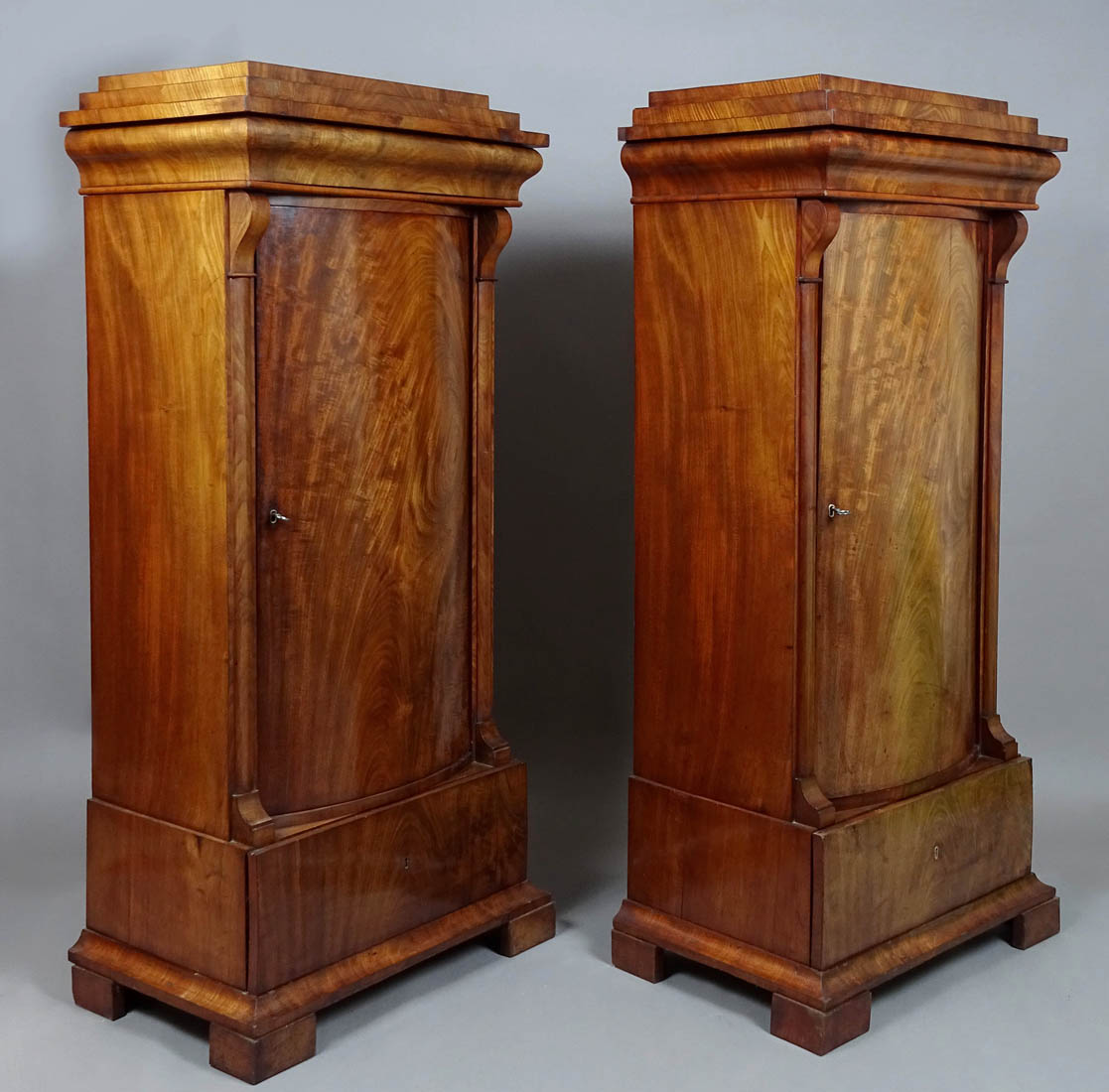 Para szafek pomocniczych – postumentów w stylu Empire. Zamykane jednym skrzydłem giętych drzwi, z dużą szufladą na dole, w obu elementach wpuszczane, stalowe zamki i klucz. Blat z trzema poziomami ułożonymi schodkowo, najmniejszym na górze, a pod nim wysuwana szuflada. Po obu stronach profilowane listwy zakończone na górze i na dole zdobnymi klockami. Całość wsparta na czterech graniastych nogach, wewnątrz dwie półki.