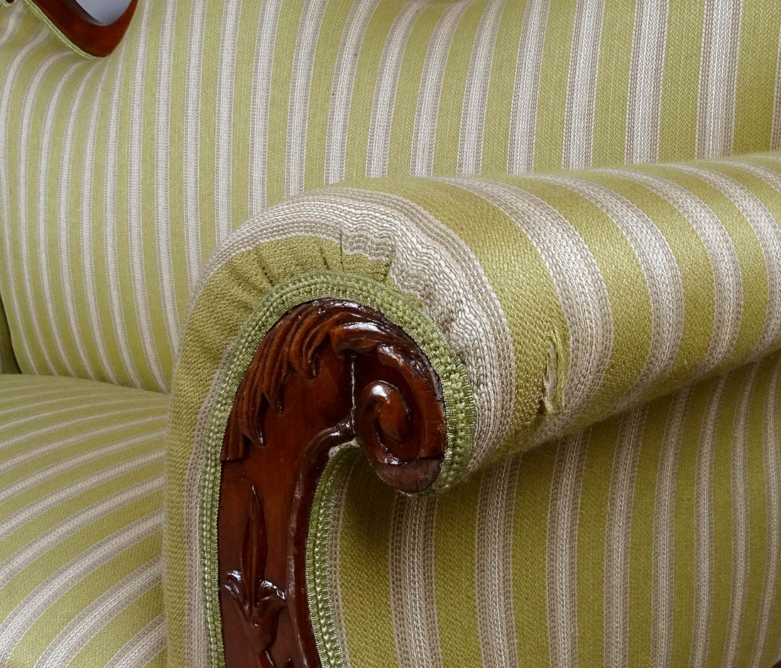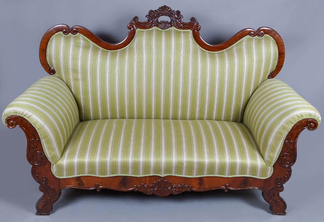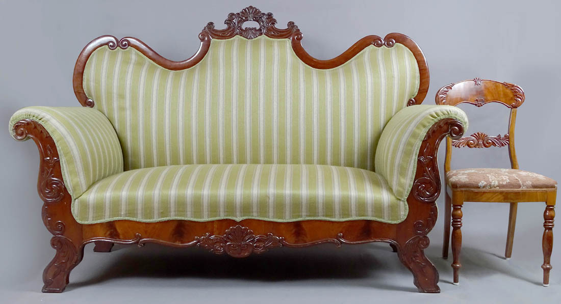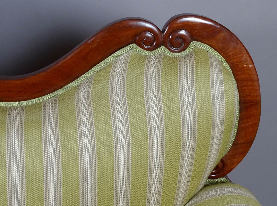 Sofa w stylu Ludwika – Filipa. o giętej linii szkieletu, tapicerowana na siedzisku i oparciu łącznie z boczkami. Wsparta na czterech profilowanych i giętych nogach, przednich rzeźbionych. Listwa frontowa szeroka, ze snycerką w postaci kielichów kwiatowych, liści akantu i muszli. Oparcie z mocno pofalowaną listwą, dekorowaną na środku ażurową aplikacją w formie listków i muszli. Materiał czysty, ułożony na pasach ze sprężynami, sofa stabilna.