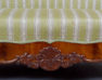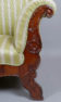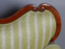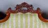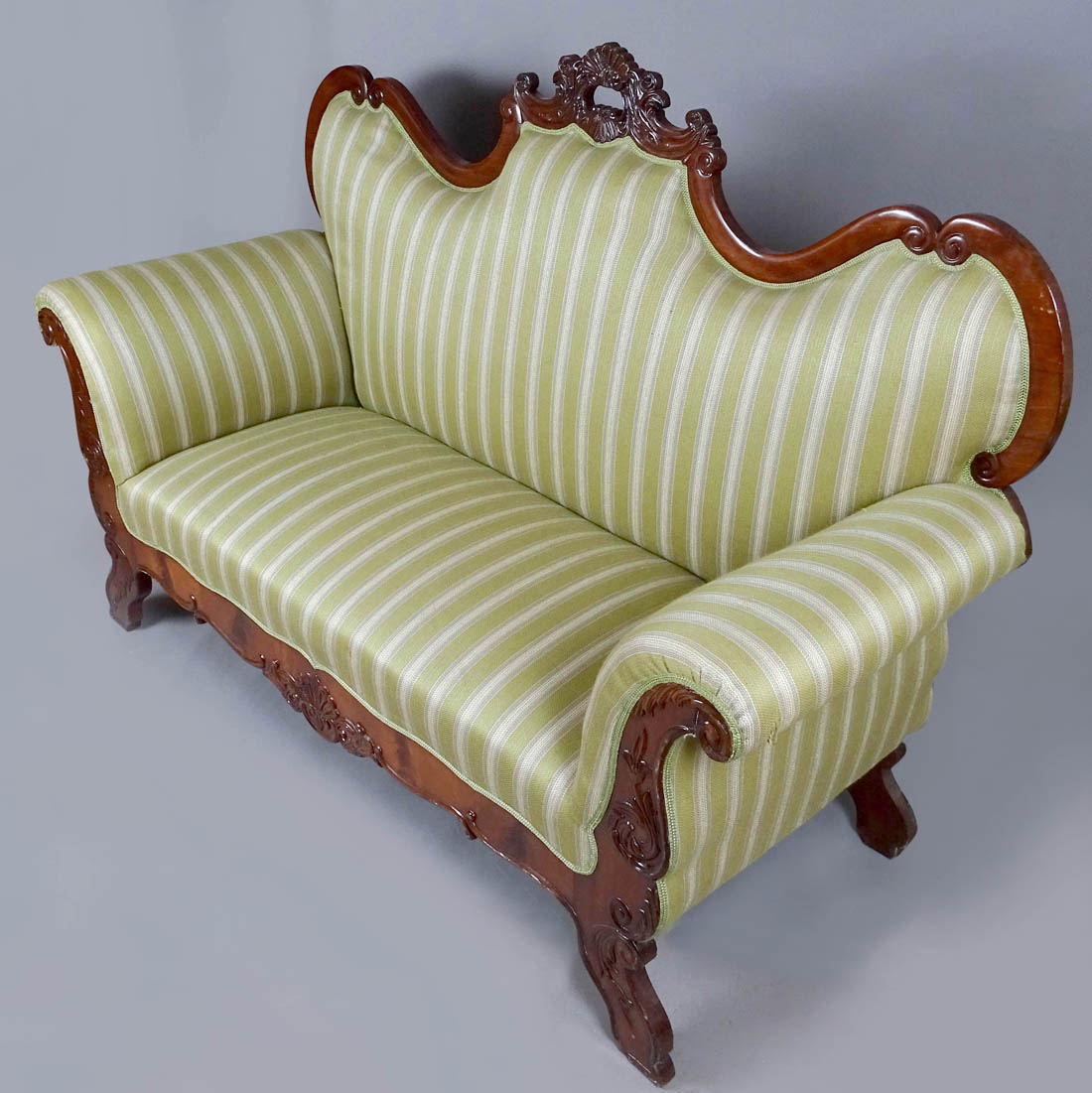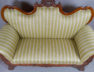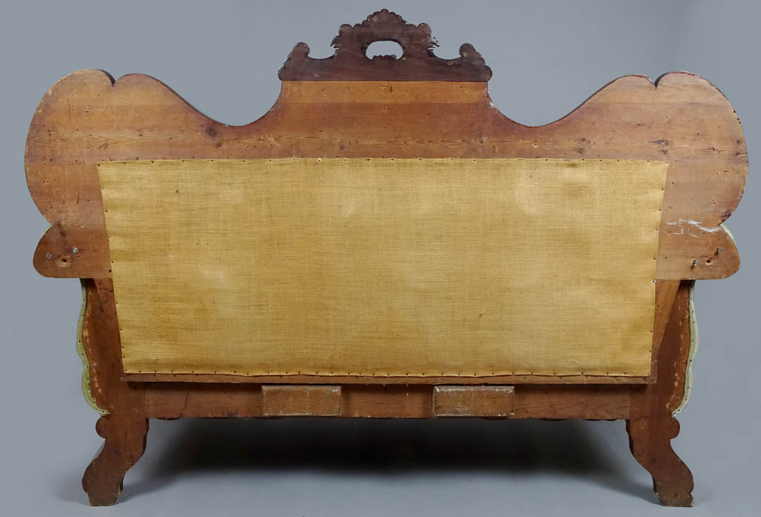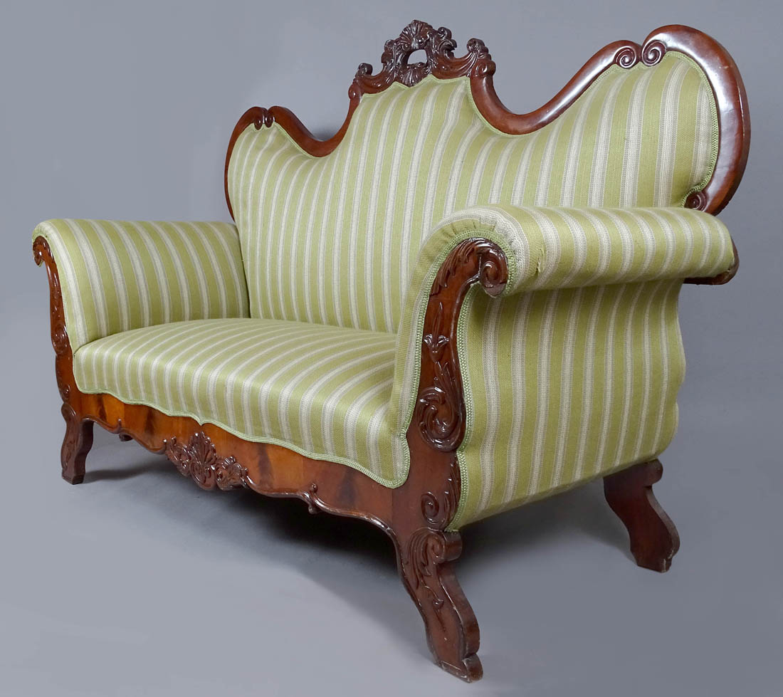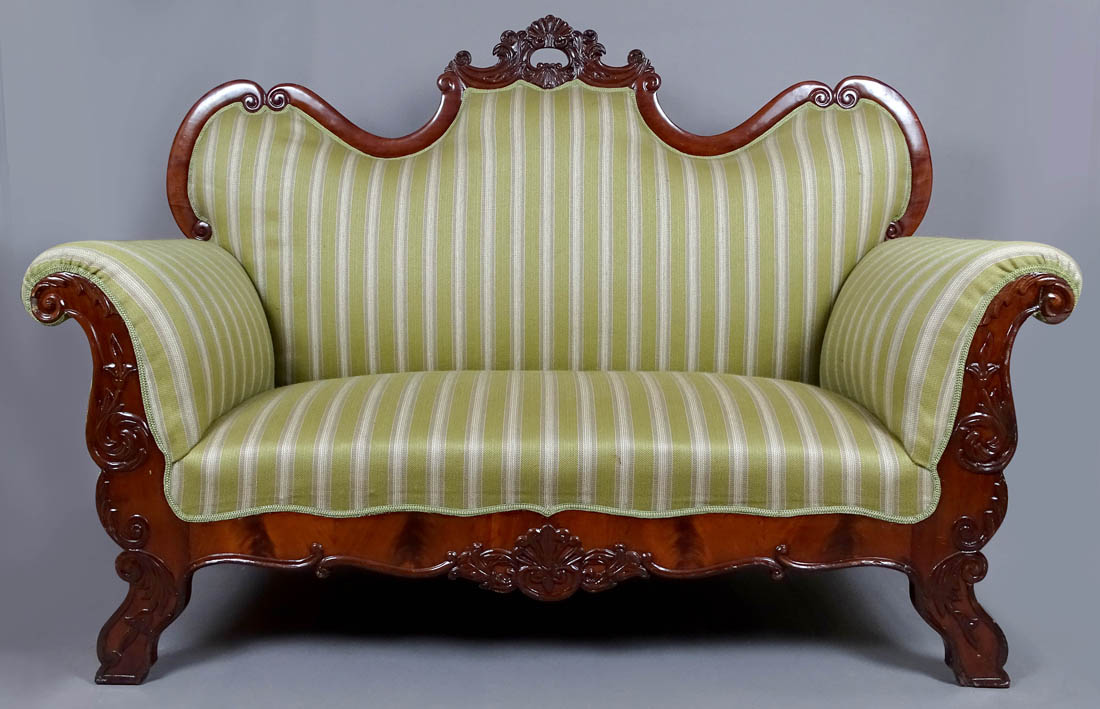 Sofa w stylu Ludwika – Filipa. o giętej linii szkieletu, tapicerowana na siedzisku i oparciu łącznie z boczkami. Wsparta na czterech profilowanych i giętych nogach, przednich rzeźbionych. Listwa frontowa szeroka, ze snycerką w postaci kielichów kwiatowych, liści akantu i muszli. Oparcie z mocno pofalowaną listwą, dekorowaną na środku ażurową aplikacją w formie listków i muszli. Materiał czysty, ułożony na pasach ze sprężynami, sofa stabilna.