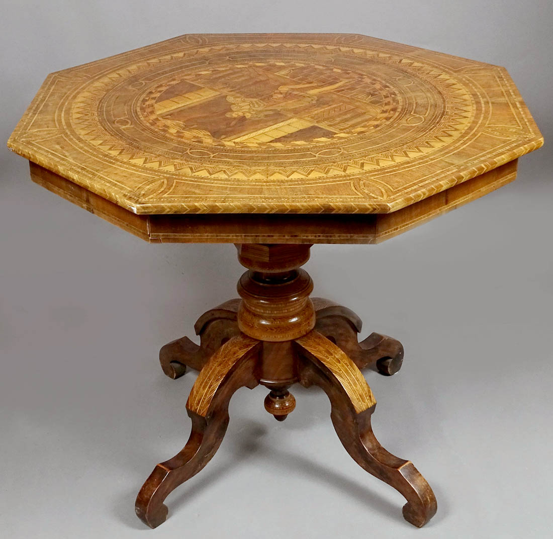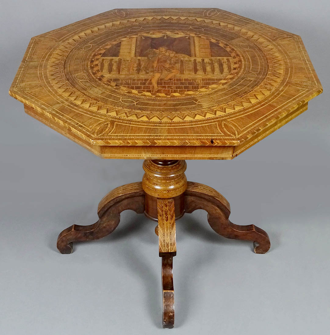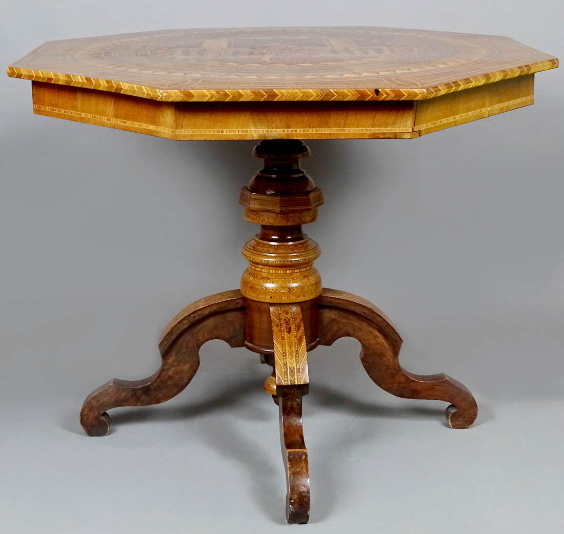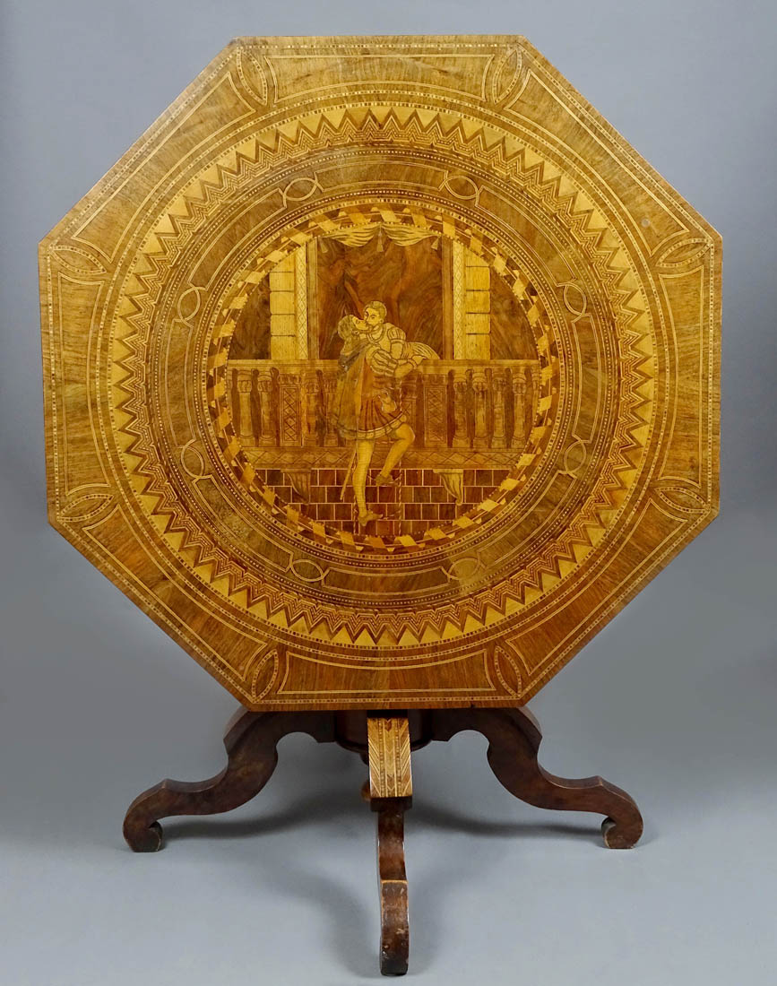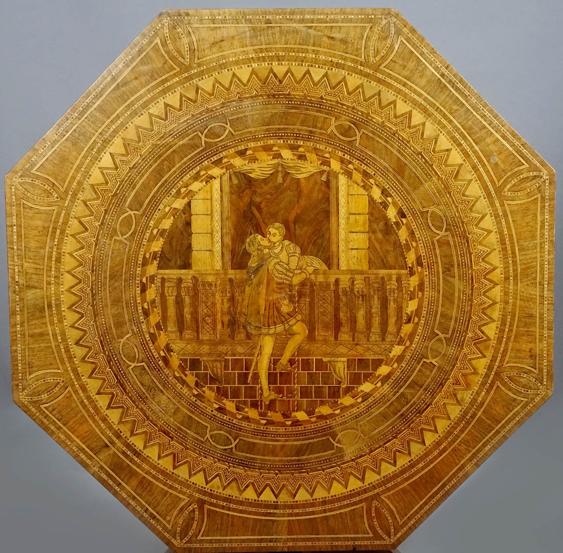 Stolik pomocniczy w typie Sorrentino, z odchylanym, intarsjowanym blatem na planie ośmiokąta, wsparty na toczonym, przewężanym trzonie z czterema profilowanymi nogami. Blat bardzo bogato intarsjowany na całej powierzchni, z wieloma wzorami geometrycznymi, żyłkami połączonymi ze sobą, w centralnej części przedstawiający zakochaną parę na tle balustrady antycznego budynku. Podobne intarsjowane wzory na brzegu blatu i trzonie pod nim oraz górnych części nóg. Pod spodem drewniany mechanizm do blokowania położenia blatu.
