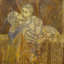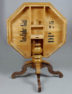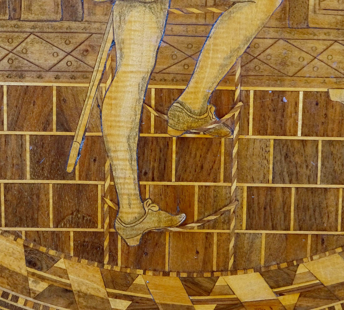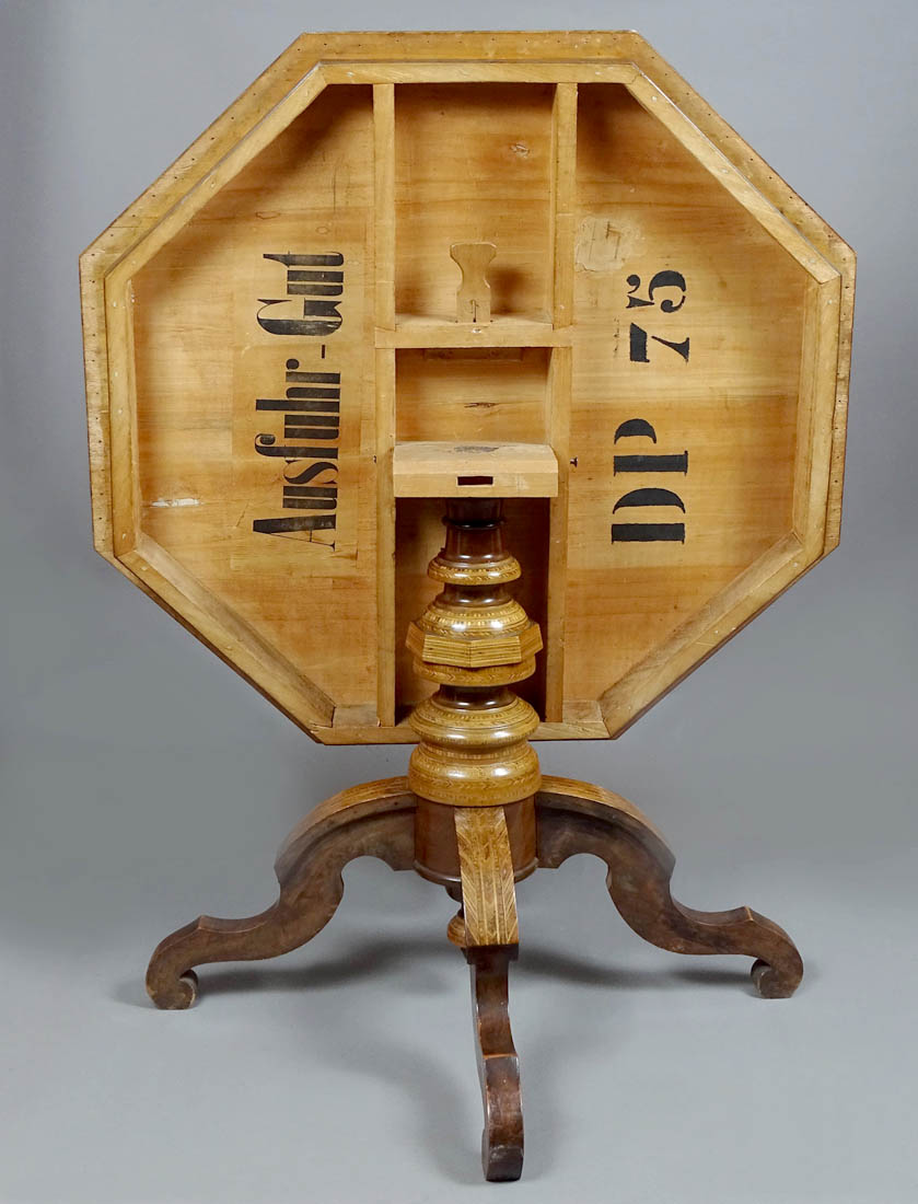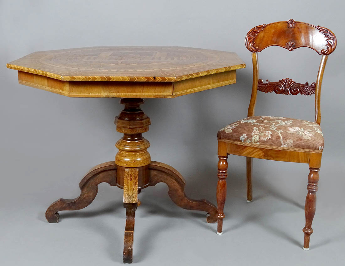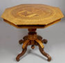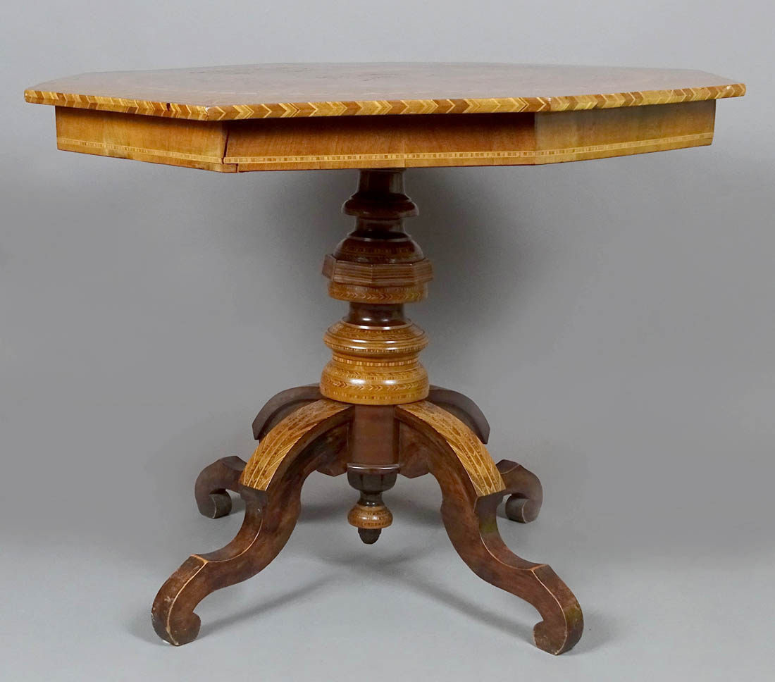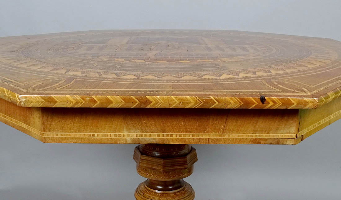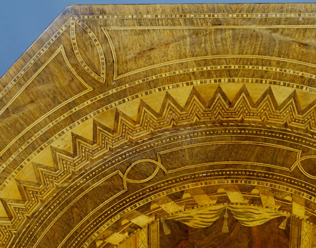 Stolik pomocniczy w typie Sorrentino, z odchylanym, intarsjowanym blatem na planie ośmiokąta, wsparty na toczonym, przewężanym trzonie z czterema profilowanymi nogami. Blat bardzo bogato intarsjowany na całej powierzchni, z wieloma wzorami geometrycznymi, żyłkami połączonymi ze sobą, w centralnej części przedstawiający zakochaną parę na tle balustrady antycznego budynku. Podobne intarsjowane wzory na brzegu blatu i trzonie pod nim oraz górnych części nóg. Pod spodem drewniany mechanizm do blokowania położenia blatu.