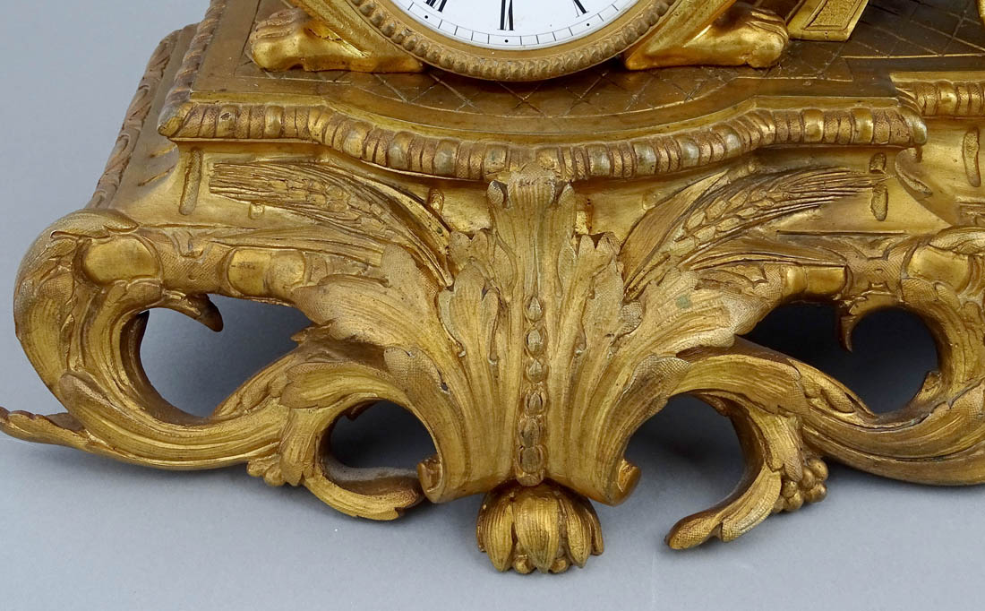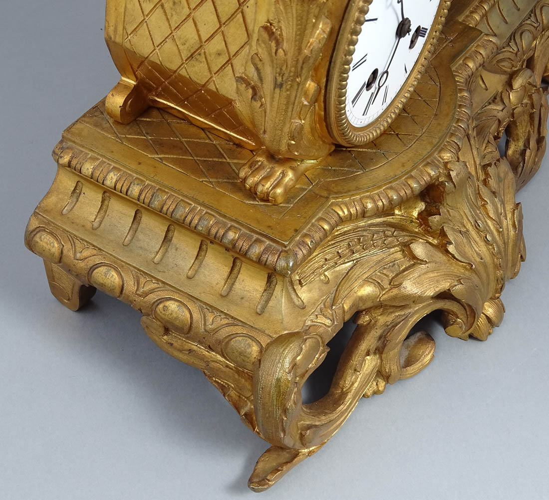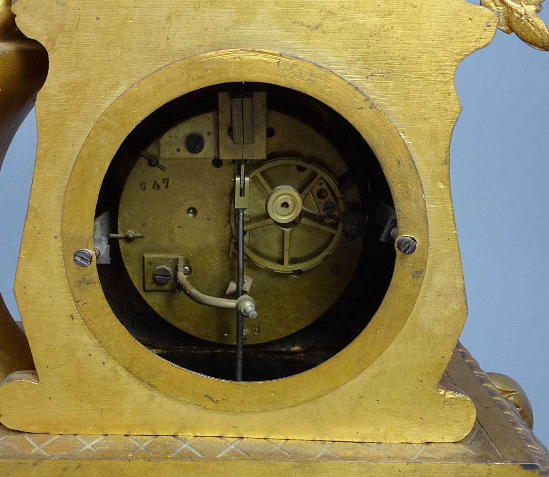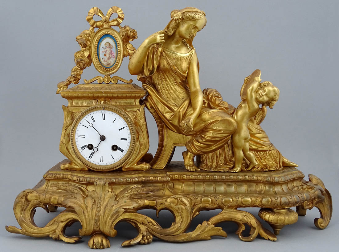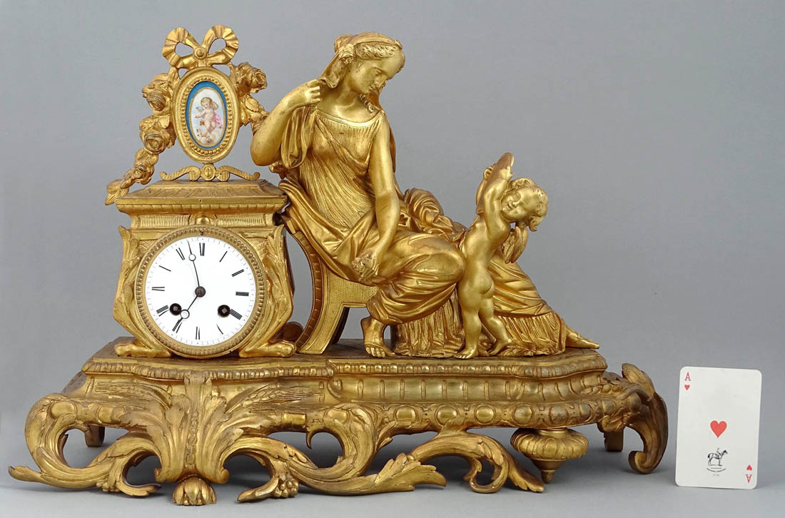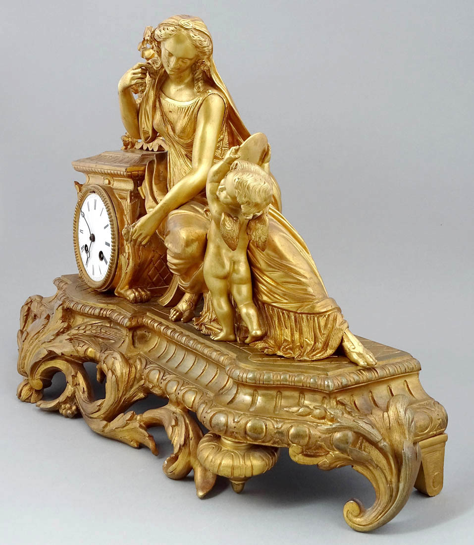 Zegar kominkowy z Afrodytą i Amorem o podstawie kształtem zbliżonej do prostokąta, z nogami od frontu w postaci liści akantu i graniastych z tyłu. Powyżej postać siedzącej na fotelu Afrodyty, której towarzyszy amorek unoszący lustro kobiecie. Po lewej stronie postument na którego górze w owalnym polu umieszczono porcelankę z kupidynem w otoczeniu girland kwiatowych, poniżej mechanizm zegara z emaliowaną tarczą, rzymskim, czernionym podziałem godzin i wskazówkami. Zegar z systemem bicia godzin i półgodzin o naciągu sprężynowym, ze stalową czaszą dzwonka, wahadłem i kluczem w komplecie.