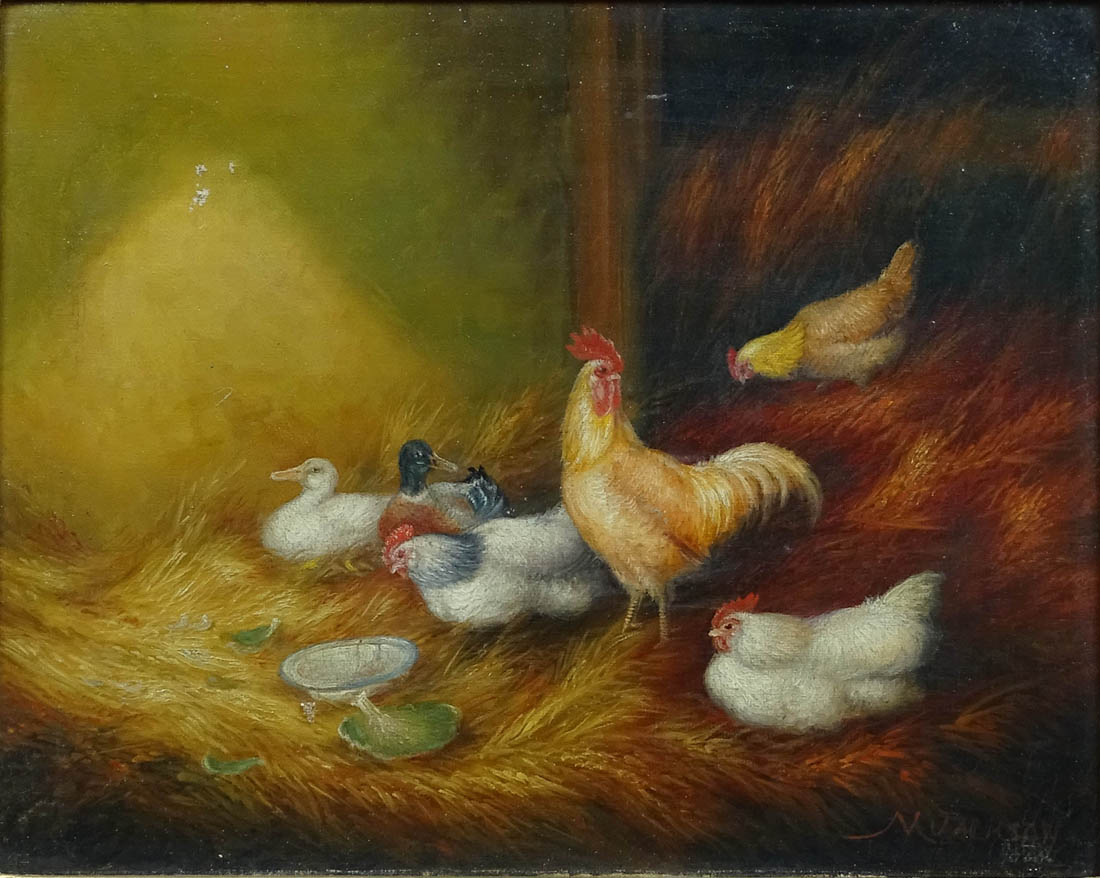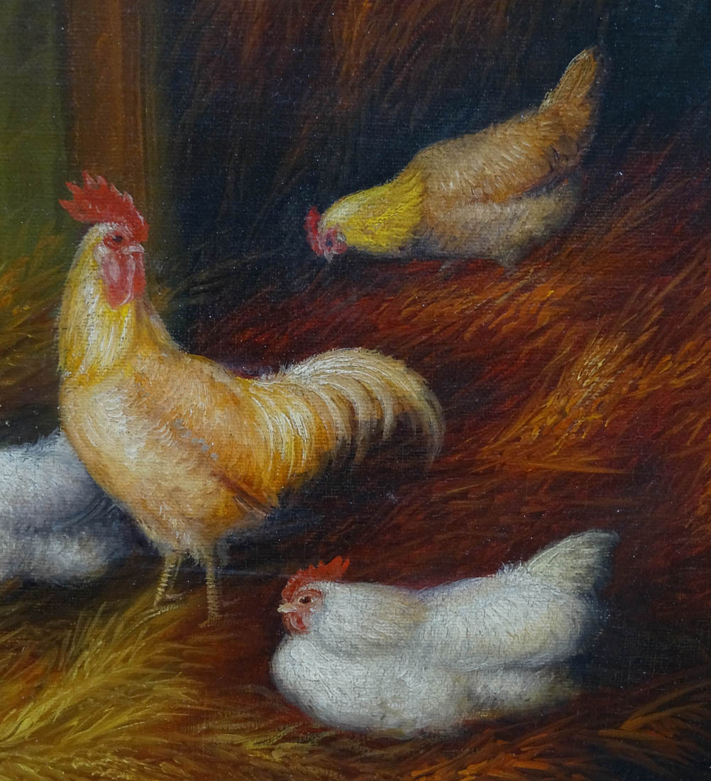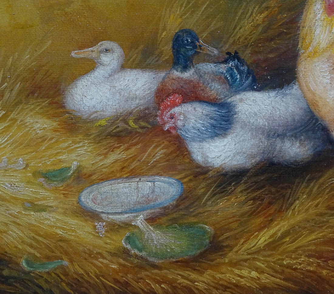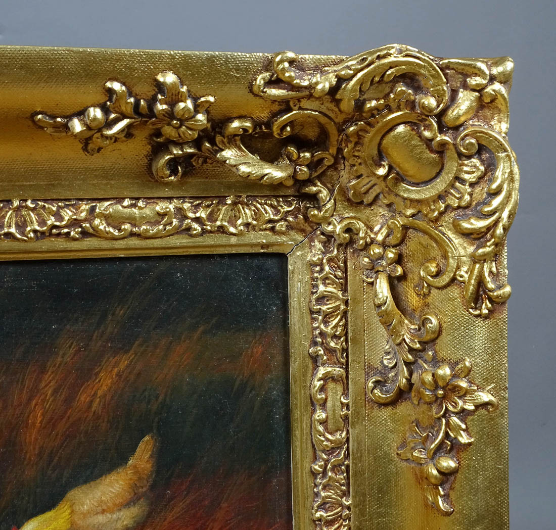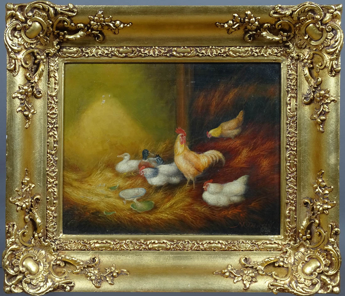 Obraz przedstawia kury, kaczki i koguta zapewne w kurniku na sianie. Przed zwierzętami znajduje się miseczką z wodą. Całość w ciepłych, żółto-czerwonych barwach, delikatnie ciemniejszy na krawędziach. Rama zdobiona w narożnikach splecionymi gałązkami roślinnymi, kwiatkami i wzorami rocaillowymi.